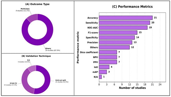 As shown in Figure 3, nearly all studies framed their prediction problems as binary classification (29/32; 91%), with multiclass outputs examined in only four studies (13%). Internal validation predominated across included studies (31/32; 97%); only one study performed external validation. Most studies used a hold-out split (21/32; 66%), and many incorporated k-fold cross-validation (15/32; 47%). Performance reporting varied, but accuracy was the most commonly reported metric (21/32; 66%), followed by sensitivity/recall (20/32; 63%) and ROC-AUC (19/32; 59%). F1-score appeared in nearly half of studies (15/32; 47%), while segmentation-focused metrics such as the Dice coefficient (7/32; 22%) and IoU (4/32; 13%) were less frequent. Detailed per-study AI model characteristics are available in Supplementary Material S6.