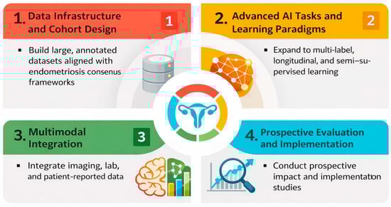 To strengthen clinical translation, we propose a staged research agenda. Near-term priorities include consistent reporting of split unit, explicit patient-level separation, leakage safeguards, uncertainty/precision (including confidence intervals), and calibration when probabilities are used; evaluation should increasingly emphasize clinically relevant thresholds, decision curve analysis, and systematic failure analyses. Mid-term priorities include external and temporal validation across diverse scanners and protocols, with prespecified subgroup analyses by phenotype, lesion location, imaging quality, and reference standard (imaging-only vs. surgery/histopathology confirmation). Long-term priorities include prospective impact studies with human–AI interaction components and health–economic evaluation to determine whether AI reduces diagnostic delay, improves mapping and surgical planning, optimizes operative workflows, and benefits patient-centered outcomes equitably across settings. Long-term priorities also include advancing multimodal models that integrate imaging with clinical variables, laboratory biomarkers, patient-reported outcomes, and omics data to enable biologically informed phenotyping, risk stratification, and personalized treatment selection. Figure 5 summarizes future directions in AI for endometriosis imaging.