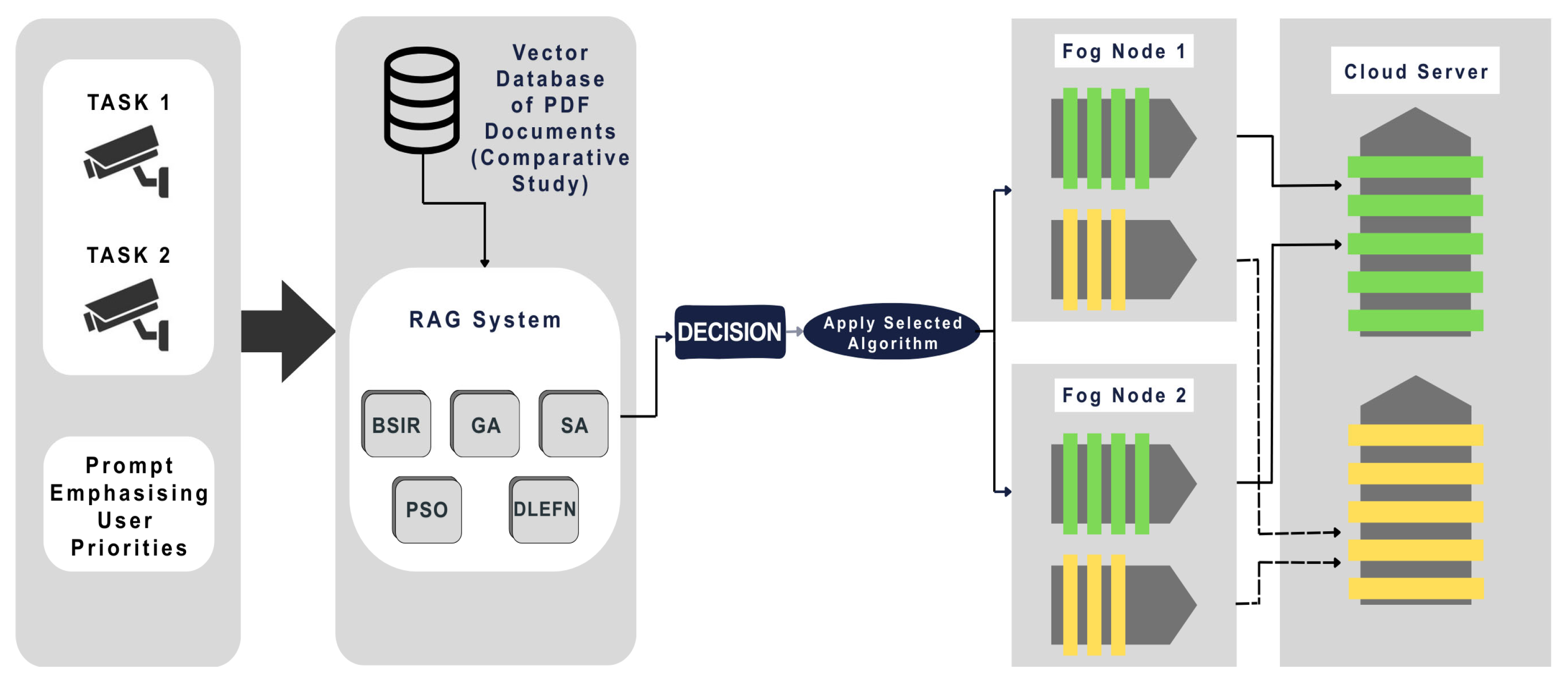 The proposed system is structured into three principal subsystems. The first subsystem is dedicated to acquiring media data from IoT devices, in addition to processing a user-defined prompt that specifies particular performance criteria. The second subsystem evaluates the collected inputs by analyzing the input characteristics received from the first subsystem and integrating a RAG model that chooses between the metaheuristic optimization methods and the novel optimization technique referred to as BSIR. Once the technique is chosen, it starts working, followed by the proposed enhancement algorithm, to derive the optimal layer-wise allocation of each application across fog nodes and cloud servers. After this optimal distribution is established, the third subsystem transitions to the execution stage. During this phase, the first layers of the application are processed on the selected fog nodes, and the resulting intermediate representations are transmitted to the cloud for computation by the remaining layers of the application.