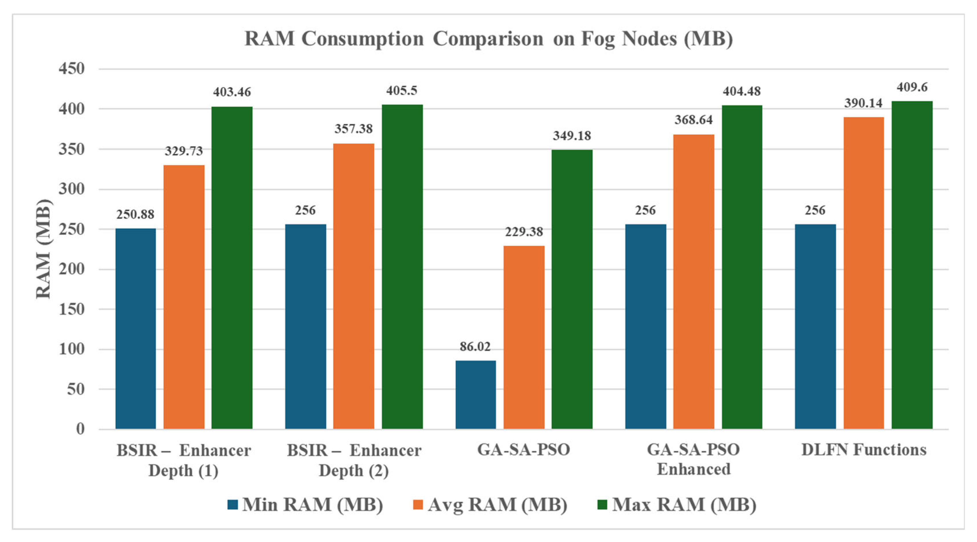 Furthermore, integrating the proposed enhancement significantly improved the utilization of available memory resources across the tested applications while remaining within safe operational limits. In the fog environment, standard implementations of GA, SA, and PSO reached a maximum memory utilization of 85.25%, whereas the enhanced versions achieved 98.75% of all available memory. The BSIR system demonstrated the highest efficiency, with memory utilization peaking at 99%. Beyond these performance gains, the enhancement standardized resource consumption patterns; GA, SA, and PSO converged at similar levels of CPU, time, and memory demands. This stabilization highlights the algorithm’s effectiveness in balancing competing system resource requirements.