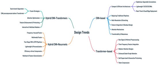 Compact CNNs [12,93] also process raw EEG inputs (Section 4.1.1); we classify them as compact designs (Section 4.1.6) to emphasize their efficiency contributions rather than input modalities. Other compact CNNs [94,95,96] also adopt spectral representations (Section 4.1.2). We also categorize these as compact designs (Section 4.1.6), since architectural parsimony is their primary focus. Some methods [78,79] combine frequency decomposition (Section 4.1.2) with topological electrode mapping. We discuss them in Section 4.1.3, since spatial encoding is their focus. Temporal CNNs [88,90,92] are also hybrid architectures that incorporate sequential models. We include them in Section 4.1.5 to emphasize their CNN-specific contributions, while broader hybridization is covered in Section 4.1.8. Benchmark studies [101,102] include compact and deeper architectures. We discuss them under benchmarking Section 4.1.7 to highlight comparative findings, rather than compactness (Section 4.1.6). Table 2 below presents a chronological overview of the studies.