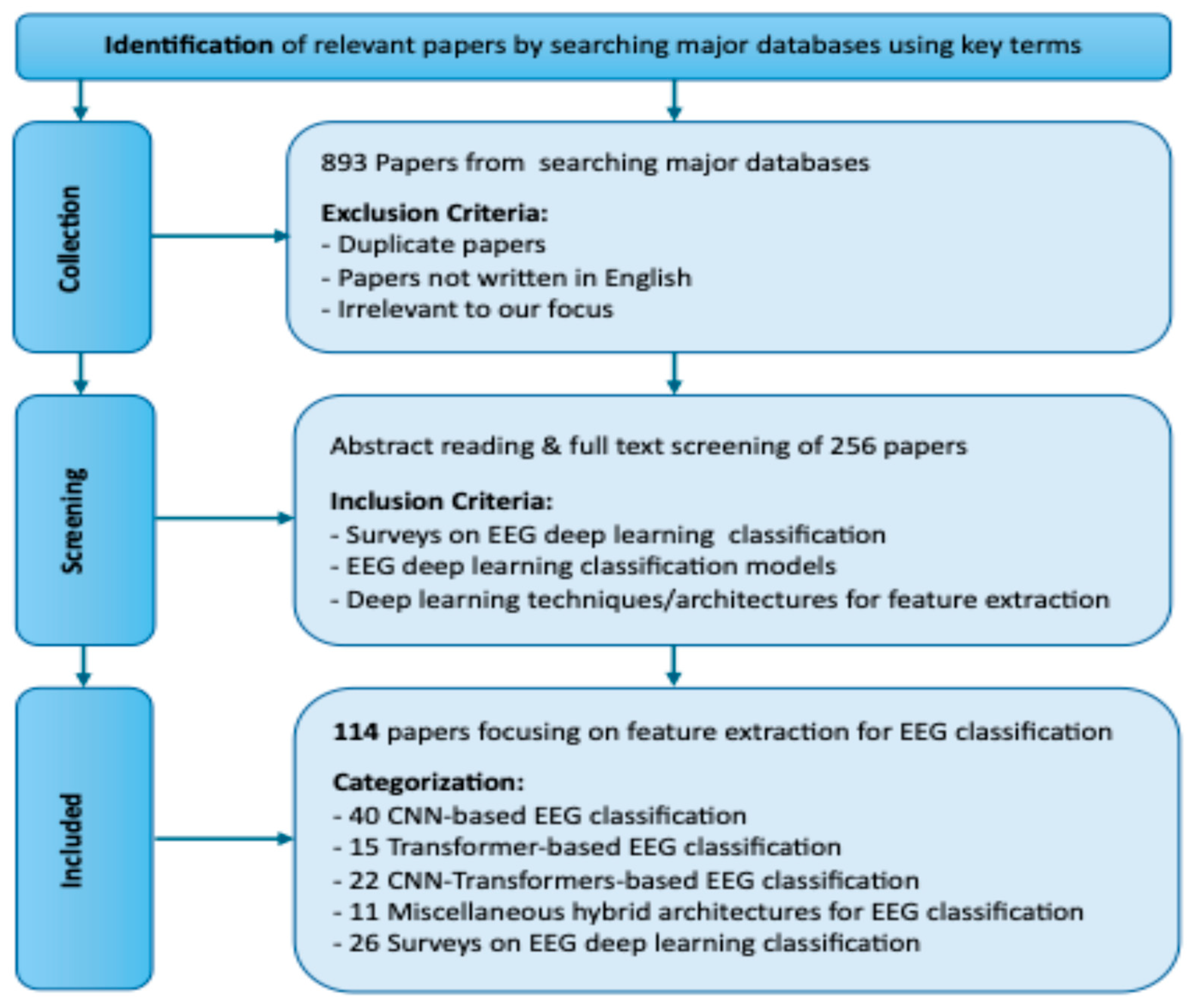 - A comprehensive review of 114 DL-based EEG classification papers, including systematic reviews, CNN-based models, Transformer-based models, CNN–Transformer hybrids, and other recurrent-based hybrids.