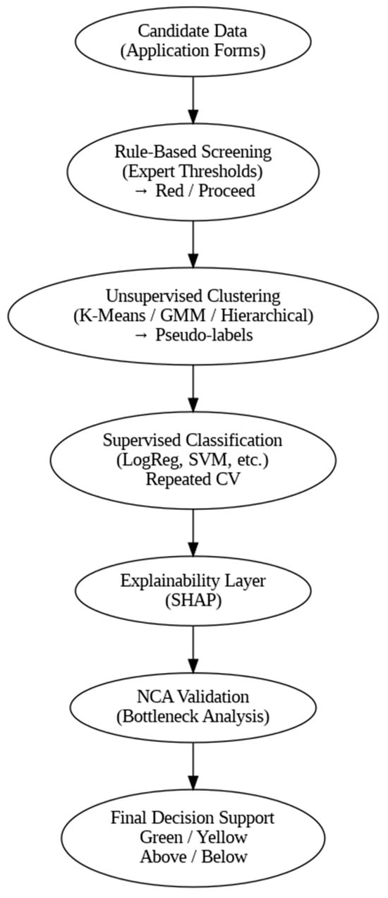 As illustrated in Figure 1, the recruitment process is organized as a sequential, multi-layered pipeline integrating expert knowledge, unsupervised learning, supervised classification, explainability mechanisms, and additional validation. Each layer serves a distinct analytical role, jointly supporting transparent and auditable decision-making while reducing uncertainty at successive stages of candidate evaluation. This layered structure reflects the need to model recruitment as a complex decision process rather than a single predictive task.