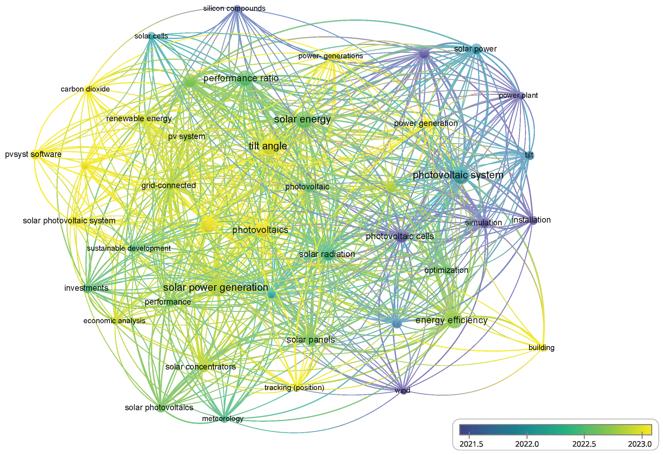 Thematic clusters are identified around solar photovoltaic system, optimization, tilt angle, PVsyst software, and energy efficiency, which constitute the main research axes. Peripheral terms such as renewable energy, simulation, and mathematical modeling further reinforce the focus on computational and predictive strategies applied to the enhancement of photovoltaic performance.