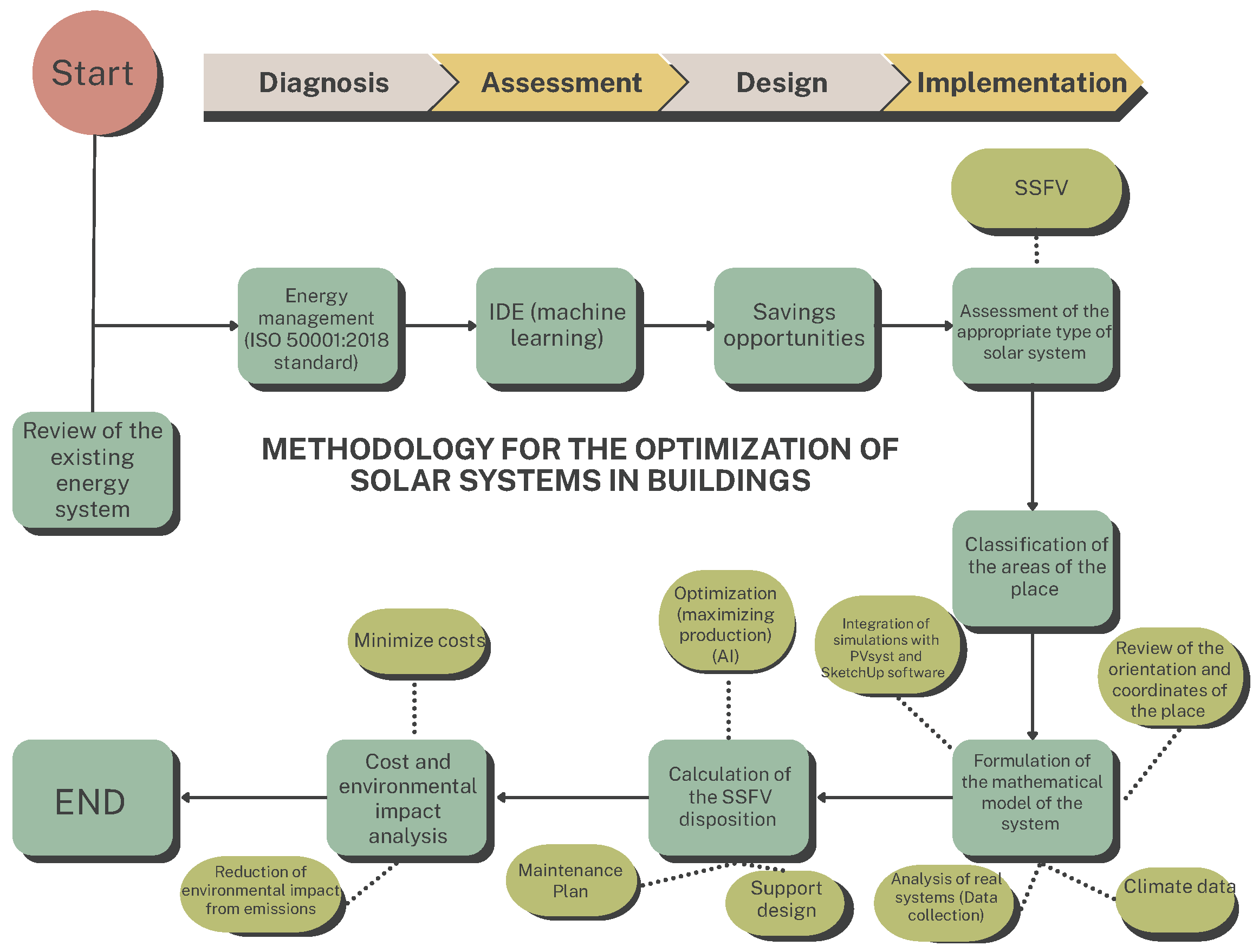 The methodological development of this study is based exclusively on mathematical modeling and computational simulations, without the use of experimental tests or physical prototypes. This approach enables a precise, reproducible, and scalable evaluation of the energy performance of photovoltaic (PV) systems under different geometric, climatic, and topographic configurations. The methodological process is structured into five main phases: energy diagnosis, mathematical model formulation, computational simulation, parametric optimization, and validation of results.