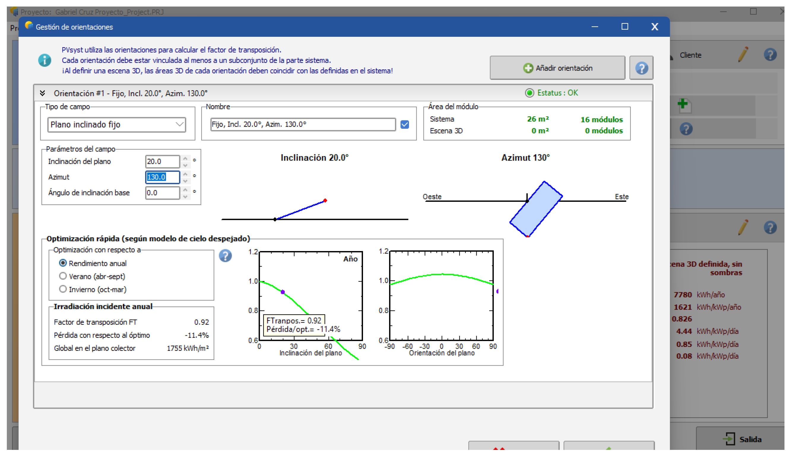 Subsequently, a heuristic–parametric optimization model is developed in Python, which evaluates combinations of tilt and orientation angles through successive iterations, maximizing the specific energy production (kWh/kWp). Each configuration is automatically processed in PVsyst, and the exported results are subjected to statistical analysis (one-way ANOVA and Tukey test) to identify significant differences between configurations.