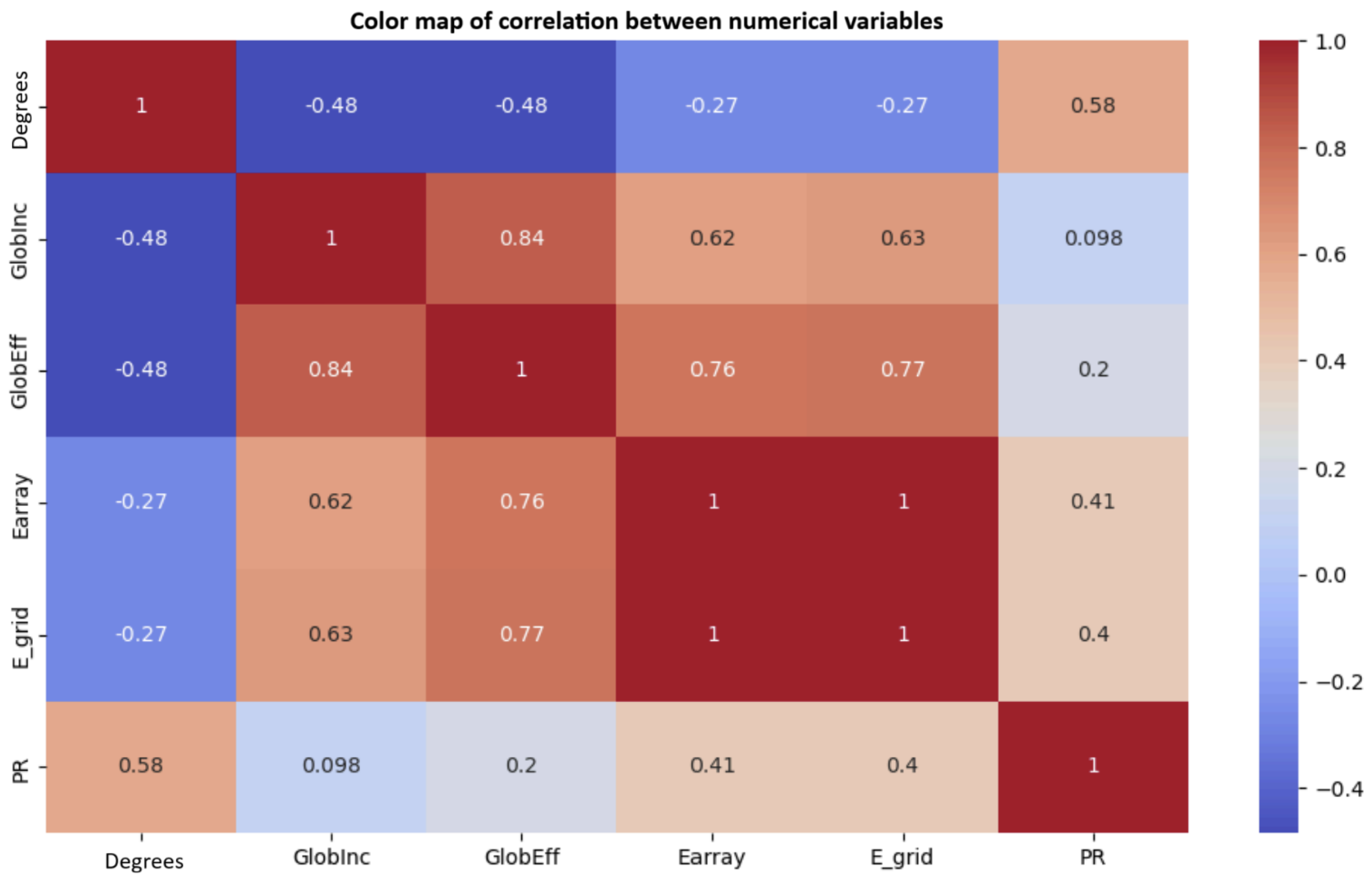 Figure 7 shows the correlation heat map among the main numerical variables analysed: global incident irradiance (