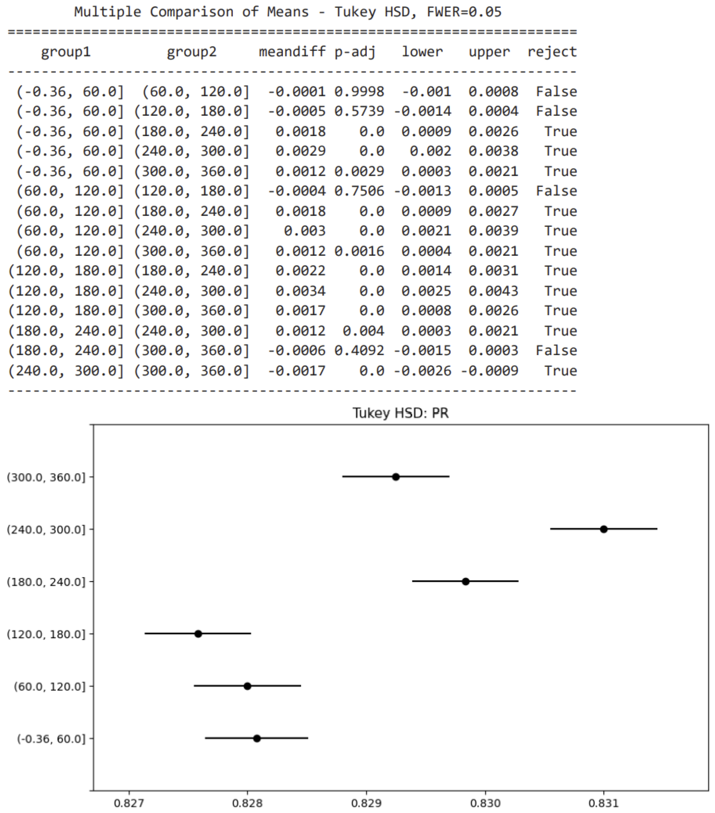 Tukey’s test made it possible to identify which groups exhibit statistically relevant differences. The ranges 120°–180° and 180°–240° show the highest mean PR values (0.830−0.831), whereas orientations between 0° and 120° present lower efficiencies (0.827−0.828). This demonstrates that southeast and south orientations are the most favourable for the solar conditions in Veracruz, a result consistent with the solar path and the seasonal distribution of irradiance.