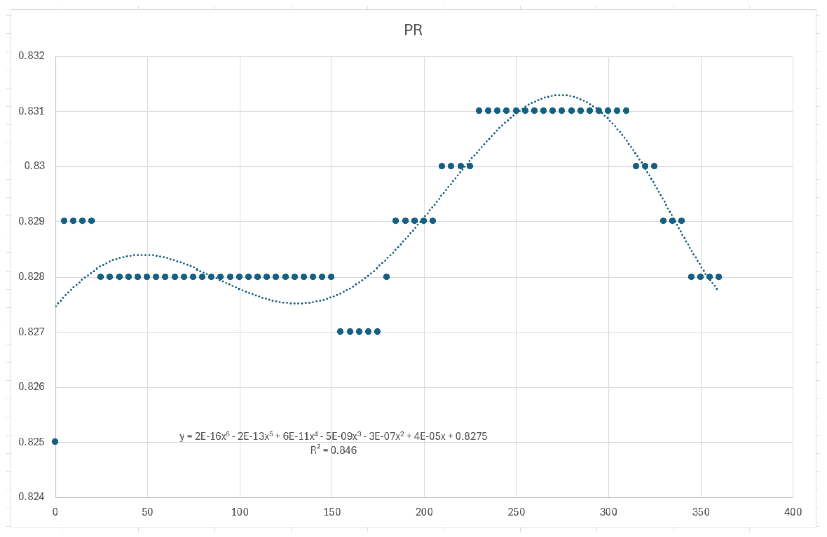 The sixth-order polynomial used in this study does not represent a physical law, but rather a surrogate regression model designed to capture the aggregated and non-linear dependence of the performance ratio (PR) on azimuth, see
