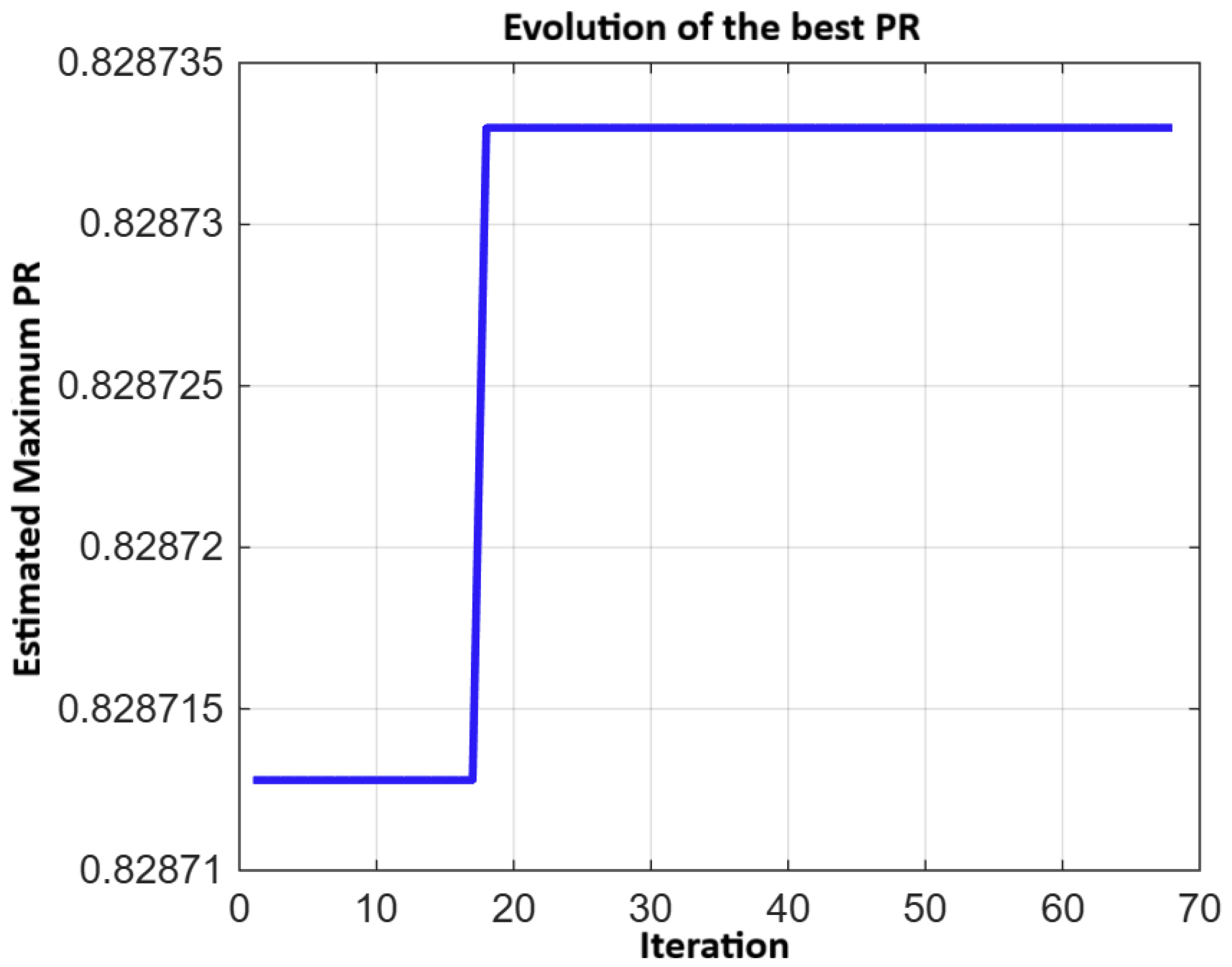 PR value over the iterations, revealing rapid convergence around iteration 20, which indicates algorithm stability and the presence of a well-defined maximum.
