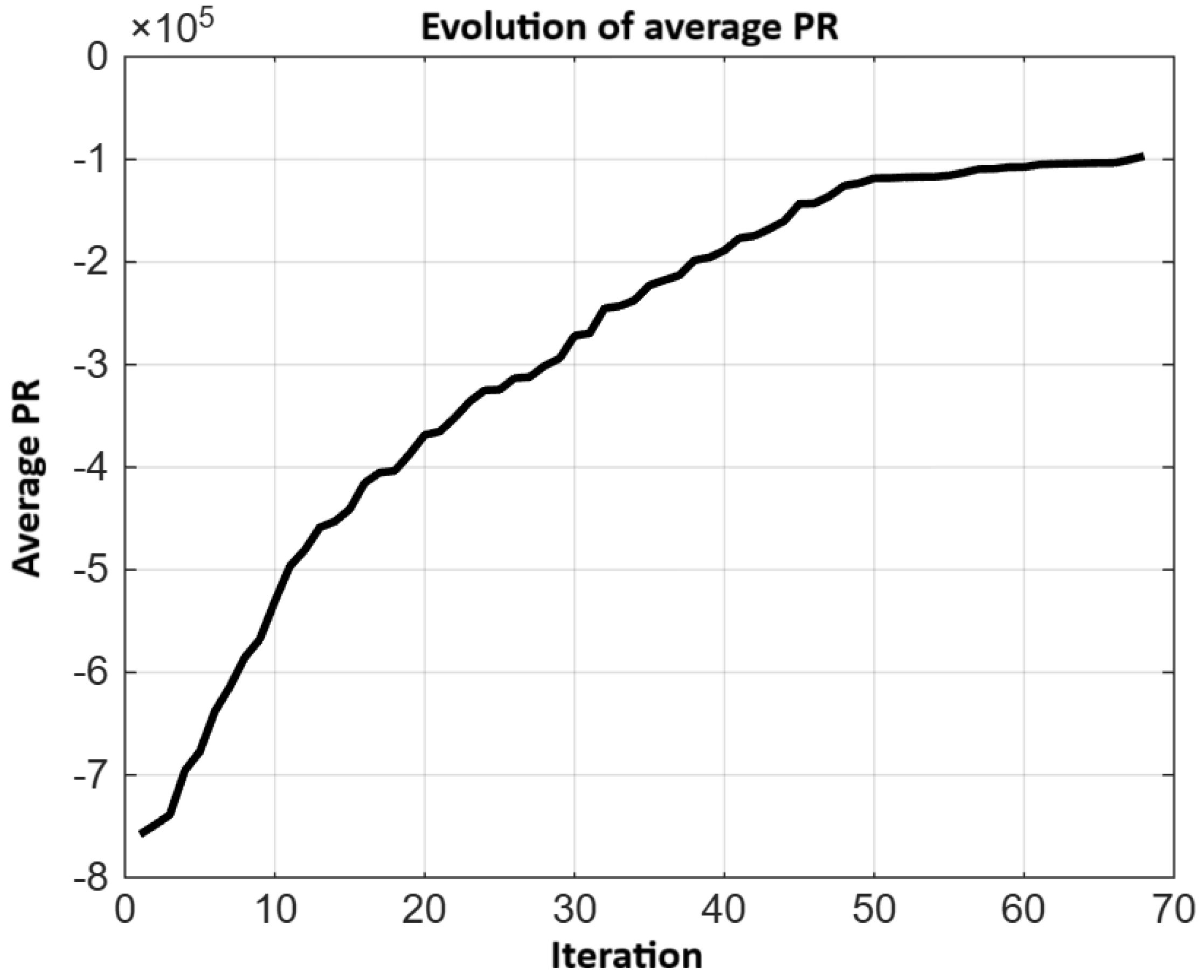 Figure 12 presents the evolution of the population-averaged performance, where a sustained increase is observed until a steady state is reached, confirming the effectiveness of the global search process.