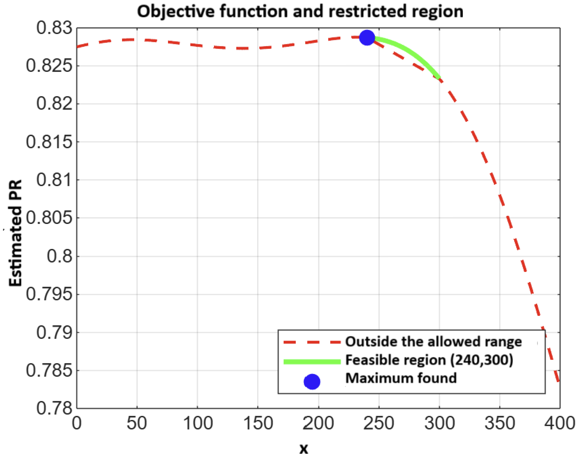 with the feasible region highlighted (in green) and the global optimum identified (blue point). The smooth and unimodal shape of the polynomial within the admissible range facilitates the search for the maximum and demonstrates that