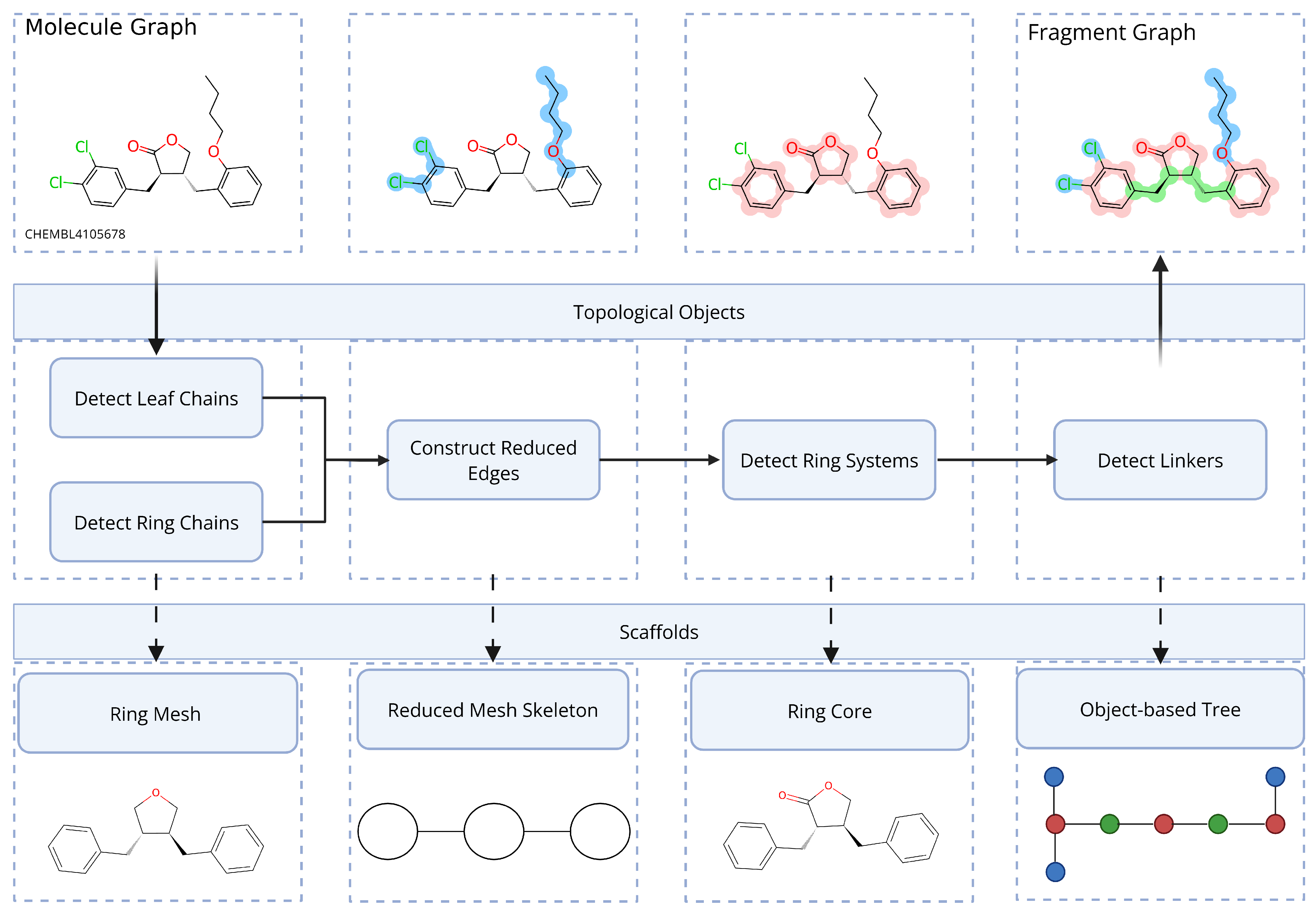Recent work has sought to address constraints through graph-based fragmentation methods that preserve structural connectivity without relying on predefined rules. Matched molecular pairs (MMPs) model local structural transformations through dual cleavages and synthetic accessibility filtering [