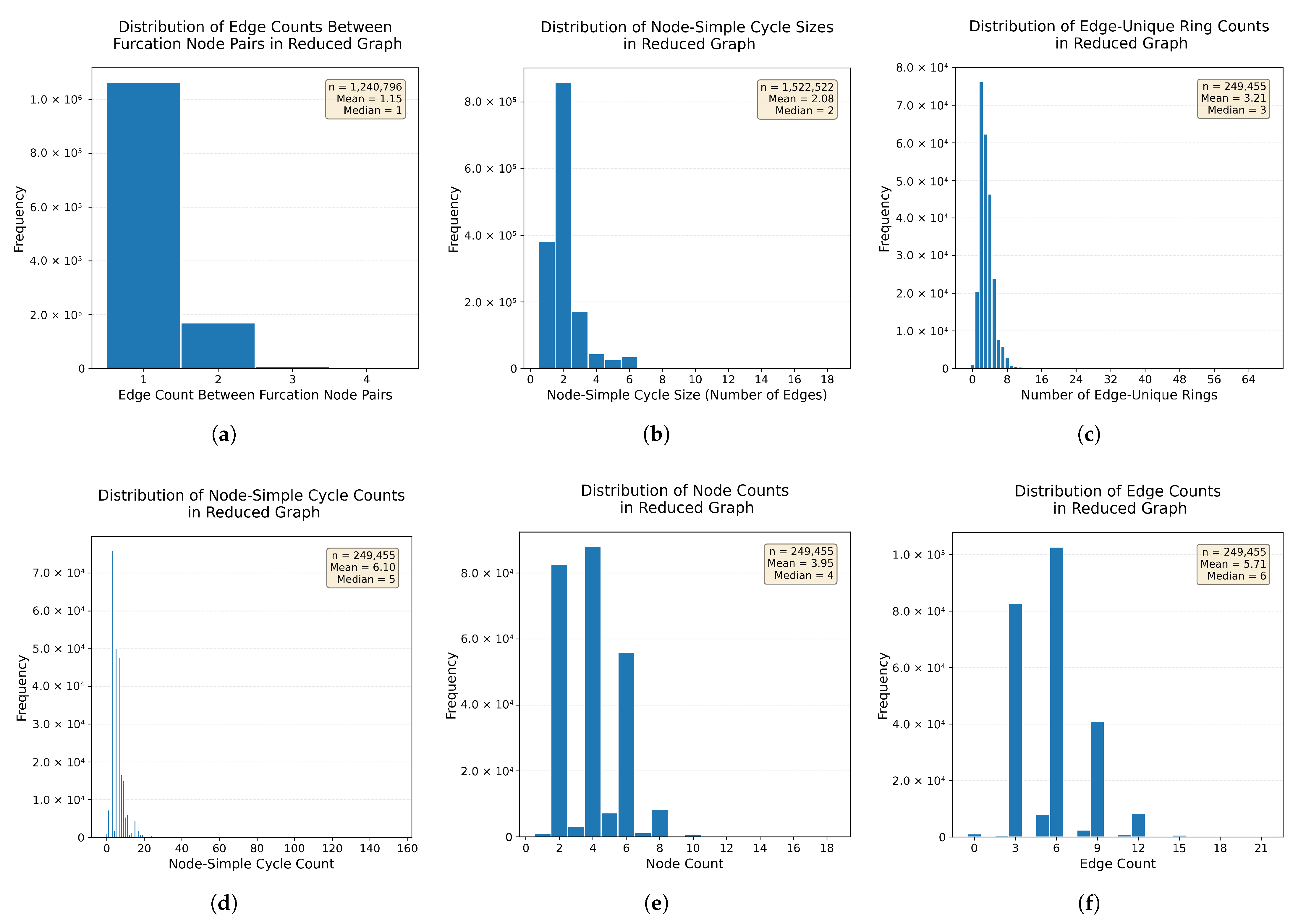 25]. On the ZINC-250K benchmark, our framework generated a rich vocabulary of chemically-valid fragments, obtaining 29,219 unique fragments from 1,638,977 fragment instances, enabling significant abstraction of the original molecular graphs. The resulting fragment library contains 19,803 leaf chain fragments, 7153 ring fragments, and 2468 linker fragments.