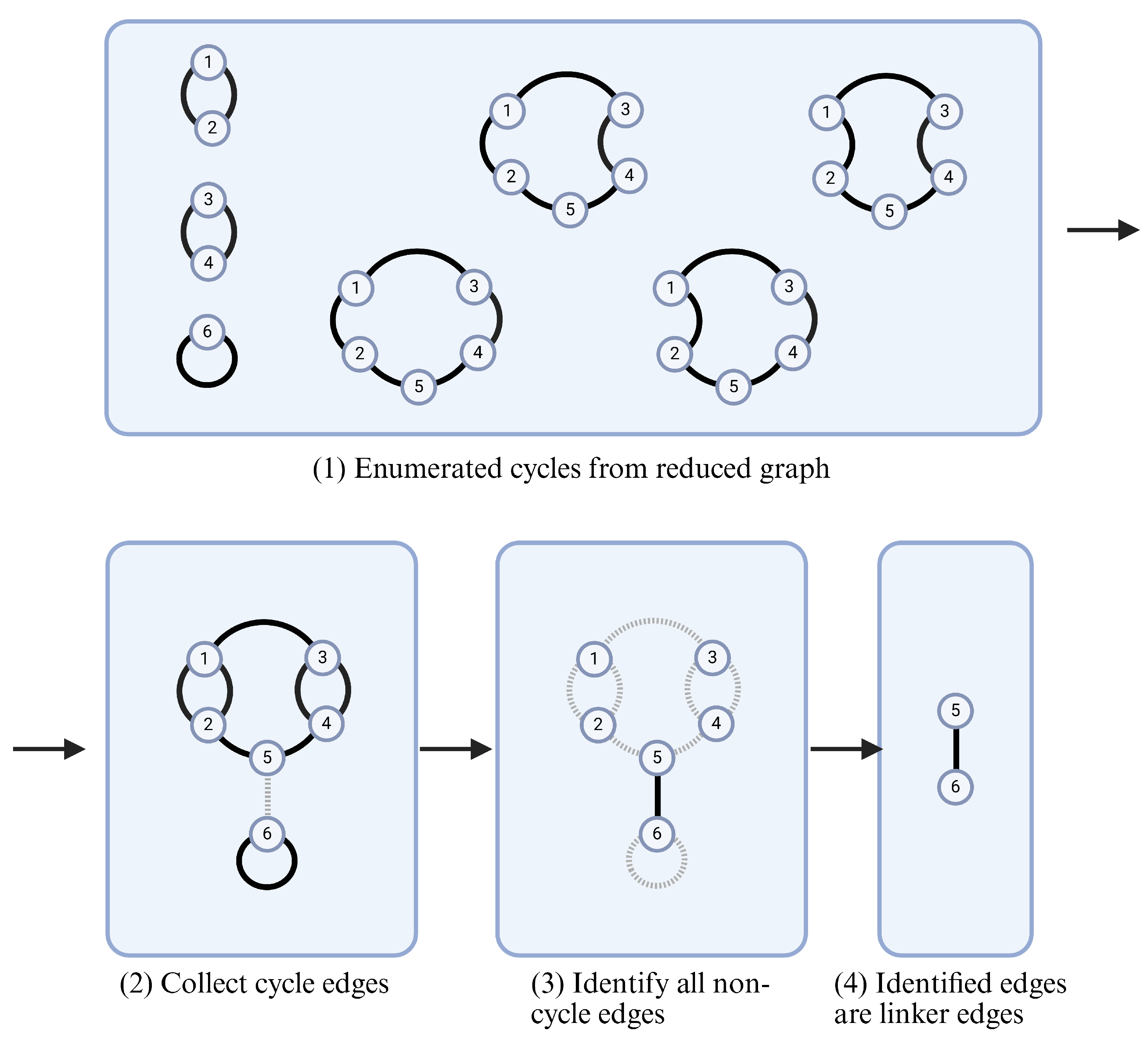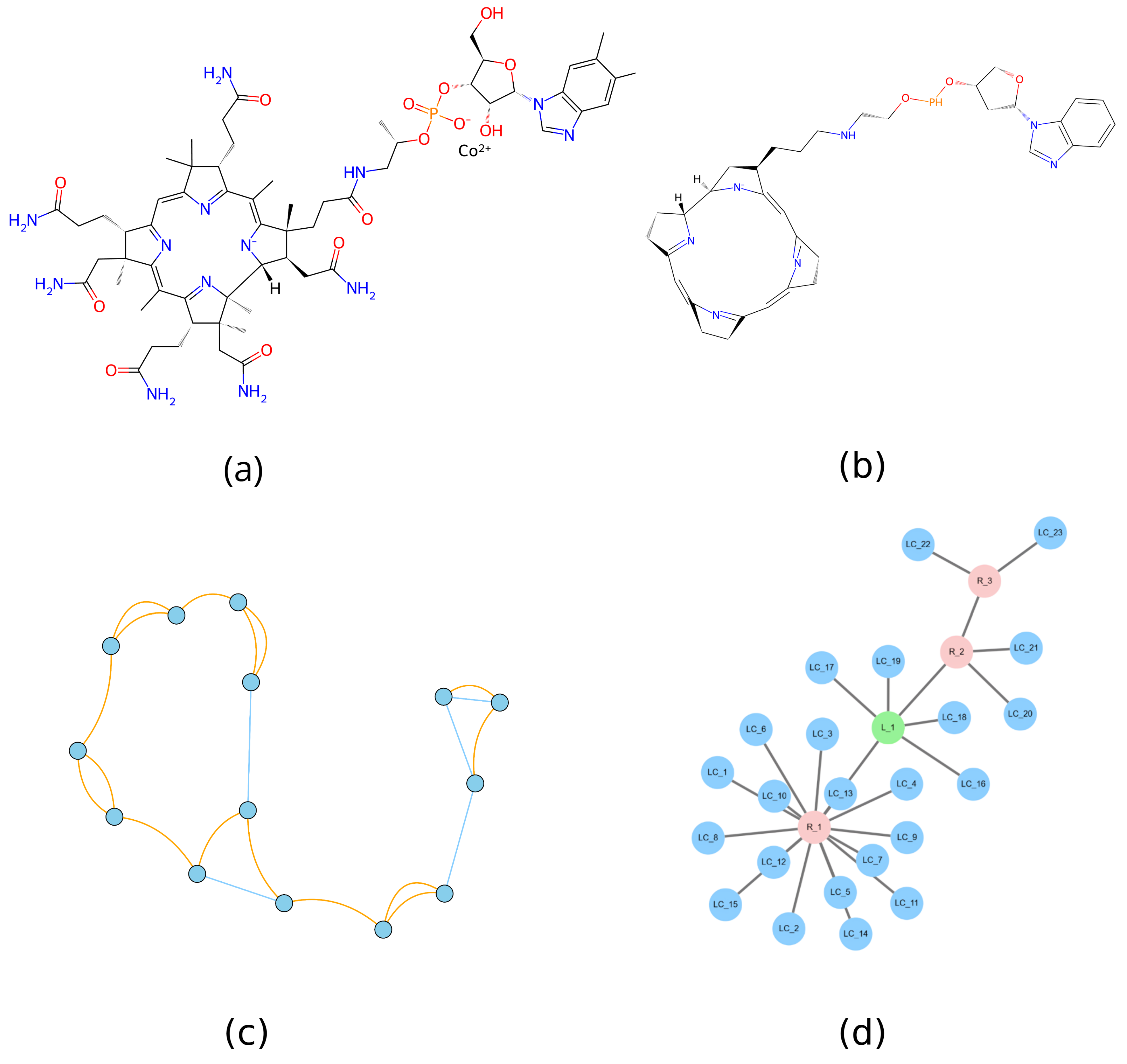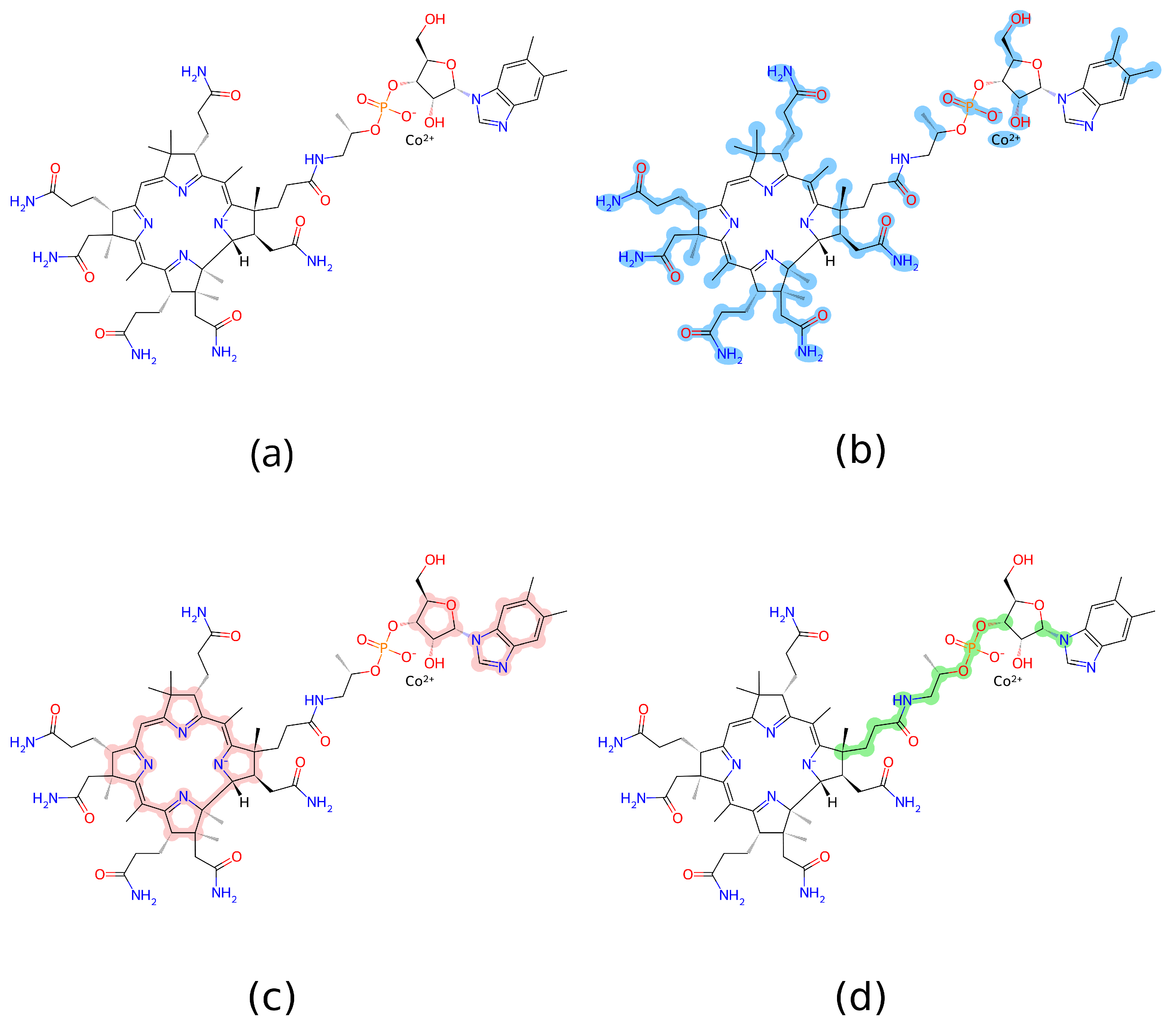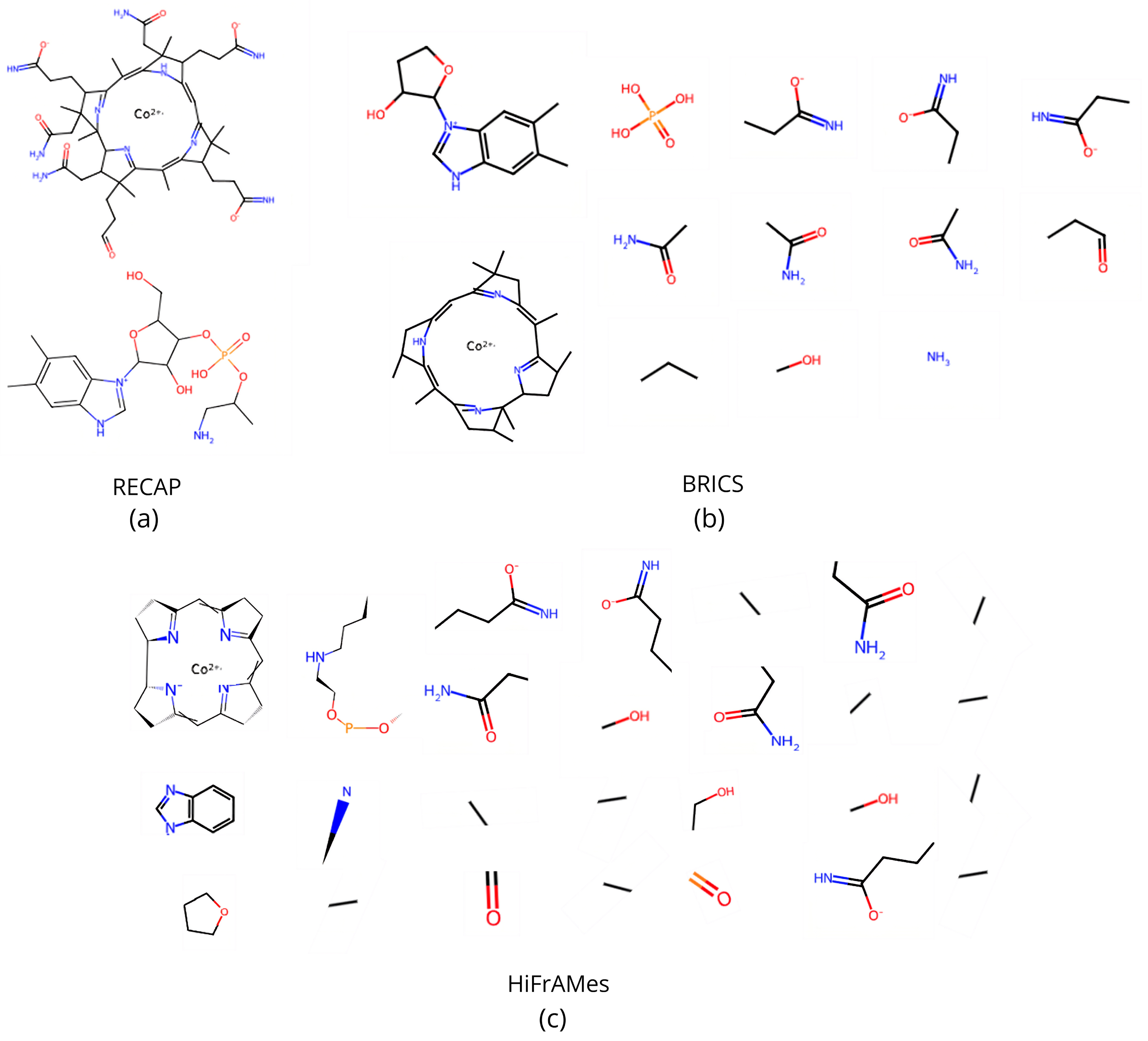 Figure 15 presents a side-by-side decomposition of vitamin B-12 using RECAP, BRICS, and HiFrAMes. RECAP produces a highly conservative decomposition, producing only a small number of large fragments in which most peripheral substituents remain attached to the corrin macrocycle or are grouped into single nucleotide-like fragments. BRICS applies more aggressive retrosynthetic bond cleavage, separating many peripheral functional groups into small, disconnected fragments while still preserving a limited number of large cores. In contrast, HiFrAMes fragments the same molecule by separating major ring systems, such as the corrin core, benzimidazole, and sugar ring, into distinct subgraphs and isolates the phosphate-containing connector as its own fragment, while extracting numerous small chain fragments. Although HiFrAMes yields a larger number of fragments for this example than both RECAP and BRICS, the decomposition reflects the underlying roles of structural components, rather than simply cleaving predefined bond types.