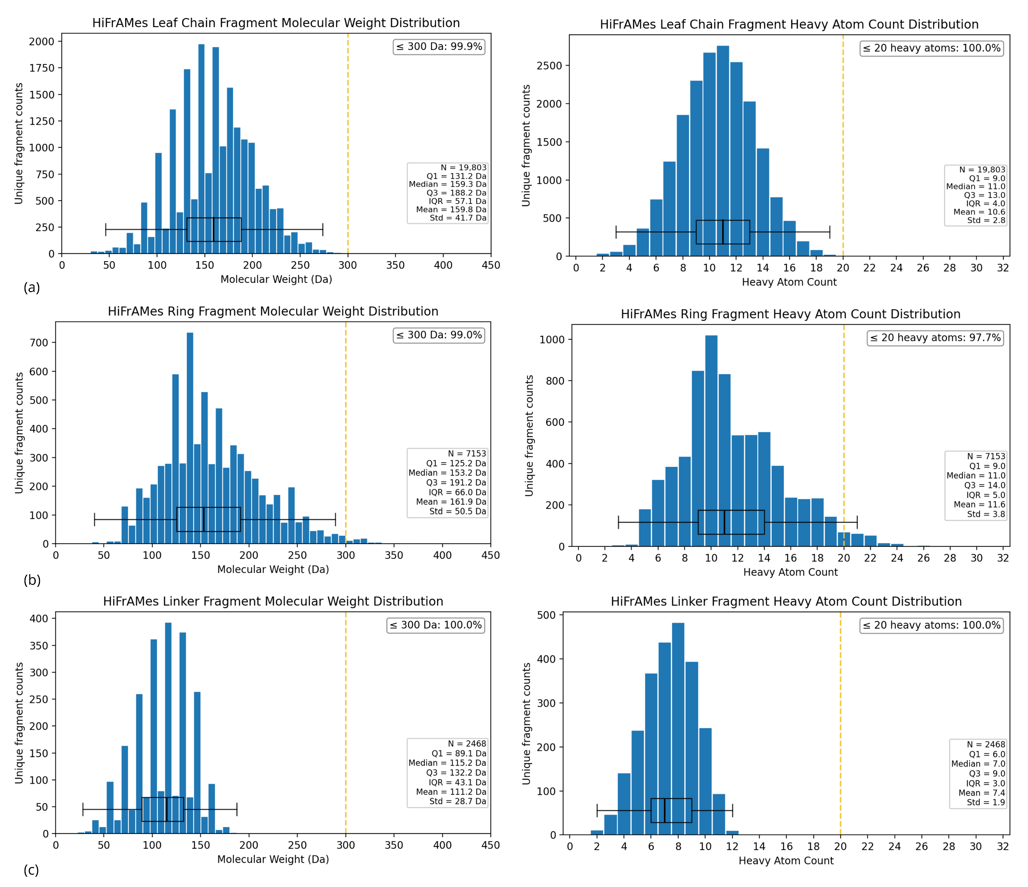Figure 11, the molecular weight and heavy atom count (HAC) distributions of HiFrAMes fragments exhibit tightly bounded and unimodal profiles across all fragment categories. Over 99% of fragments fall below the 300 Da threshold and contain no more than 20 heavy atoms, with median sizes well within these ranges. Moreover, leaf chain, ring, and linker fragments each span distinct, yet overlapping size ranges, consistent with their different roles within molecules.