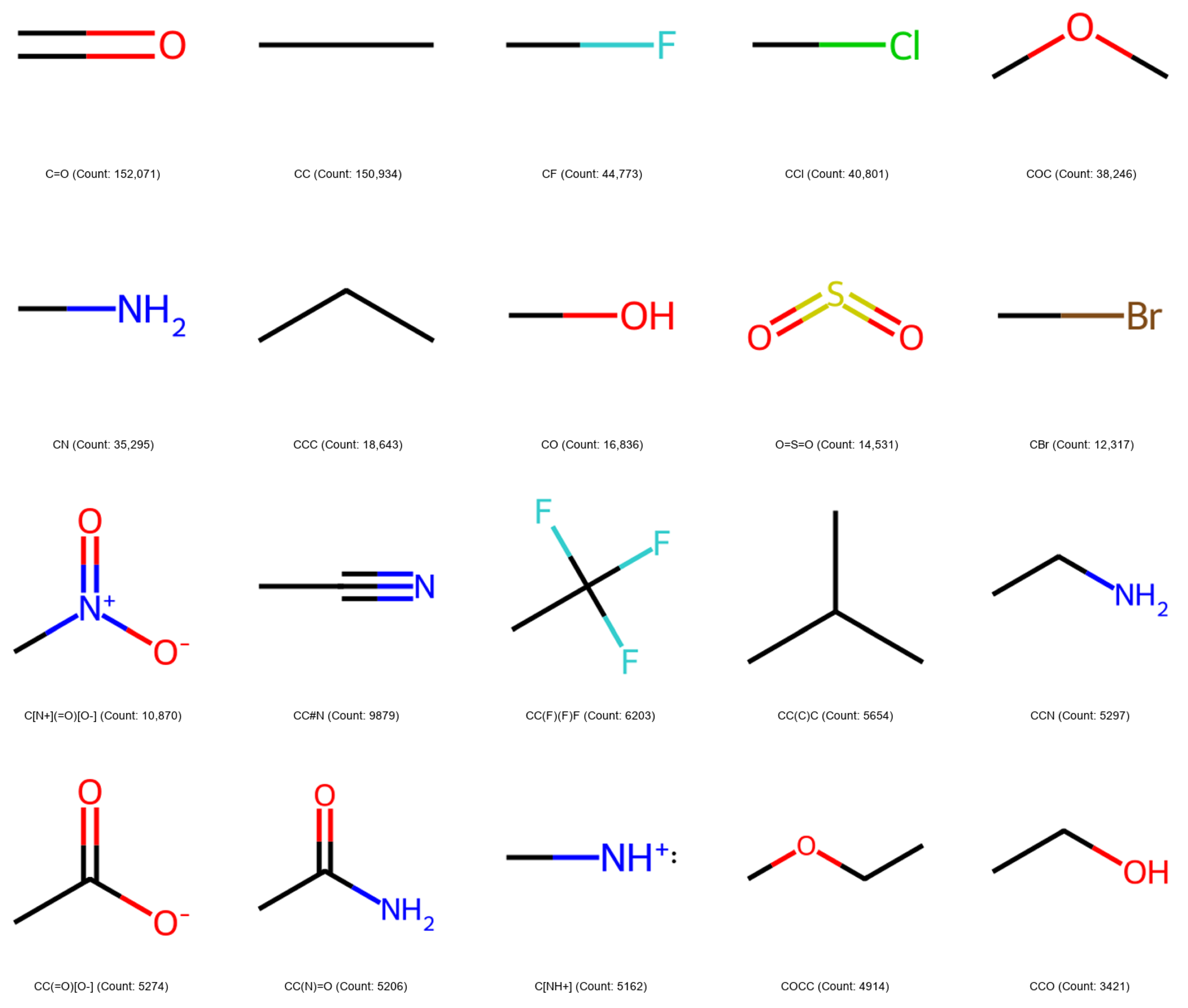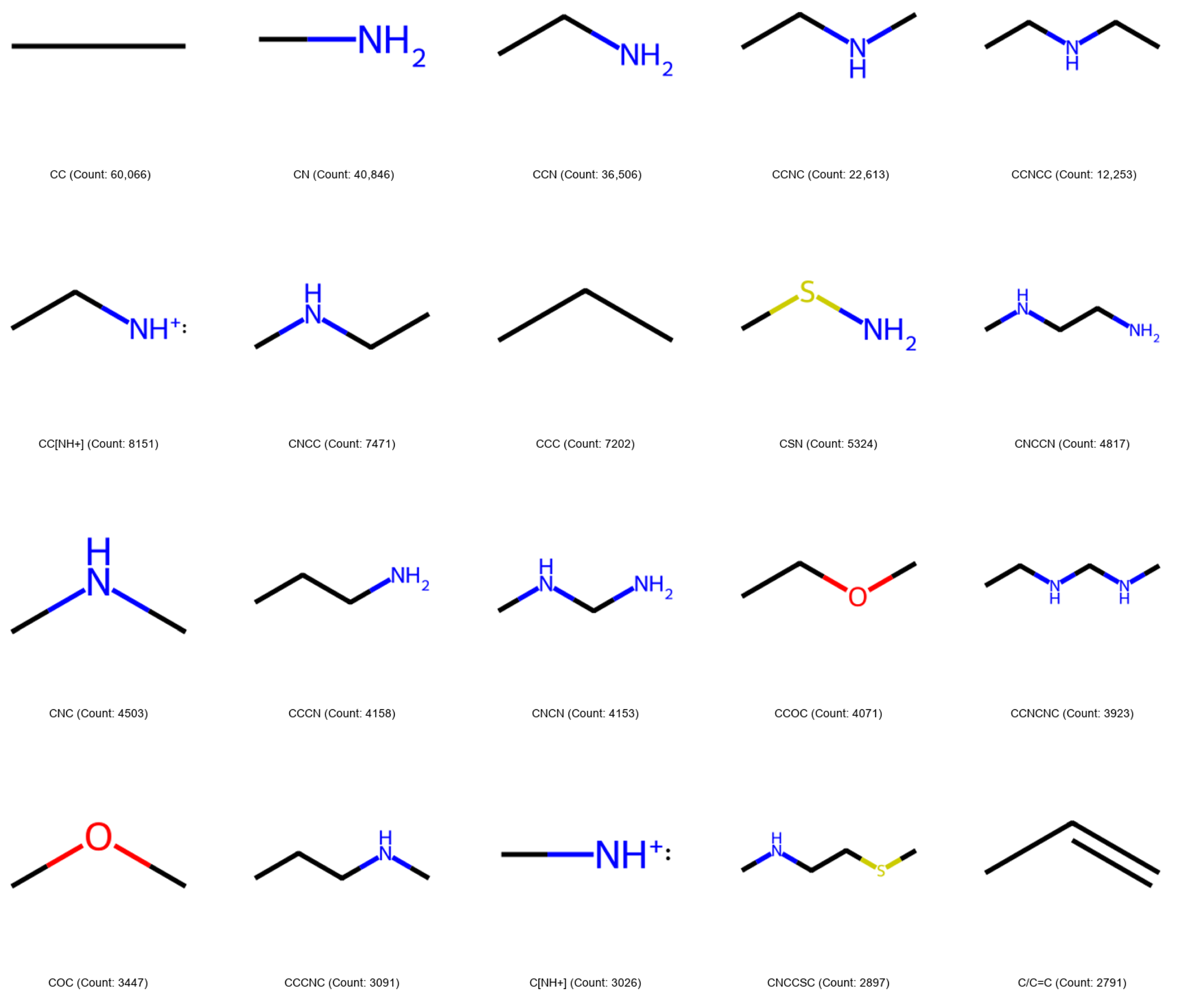 Figure 14, such as propyl (-CCC-), ethyl ether (-CCO-), and ethylamine (-CCN-), bridge larger substructures and are frequently observed as short connectors. These flexible linkers help space functional domains, modulate conformations, and often increase lipophilicity by boosting hydrocarbon content. Overall, the most frequent leaf chain, ring, and linker fragments correspond to established medicinal chemistry motifs [