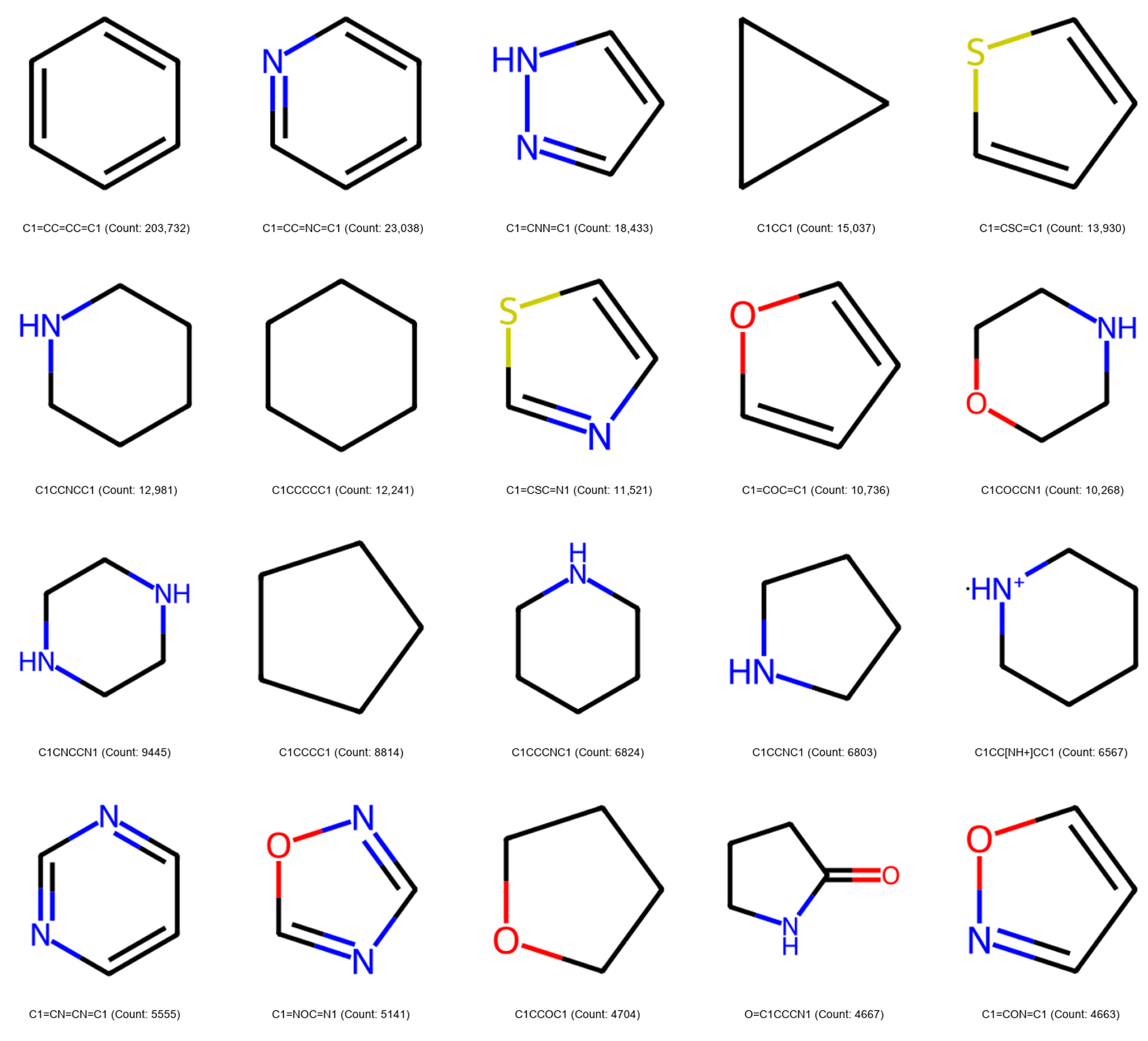 Second, the number of unique ring systems is relatively small. Many molecules reuse the same ring families shown in