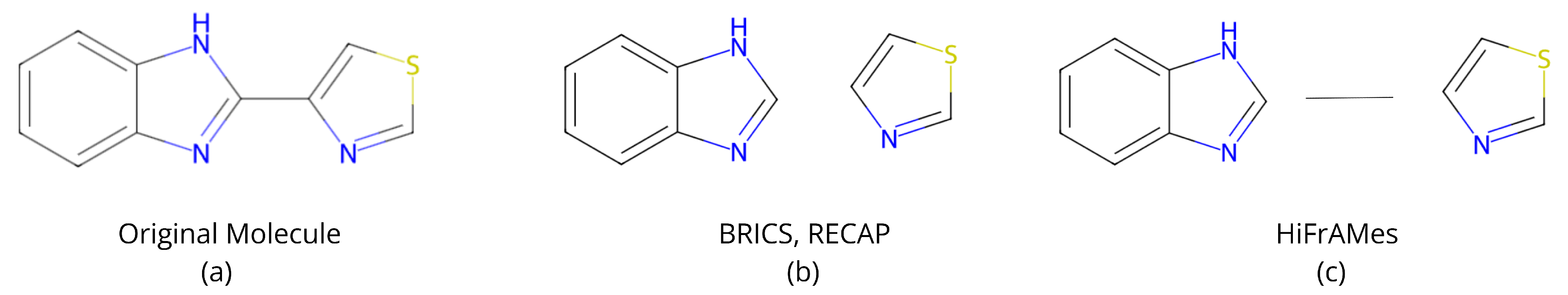 To assess the behavior of HiFrAMes relative to established fragmentation approaches, we conducted qualitative and quantitative comparisons against two widely used fragmentation methods: RECAP and BRICS. Although all three methods aim to decompose molecules into reusable substructures, they differ fundamentally in how fragments are defined, organized, and contextualized.