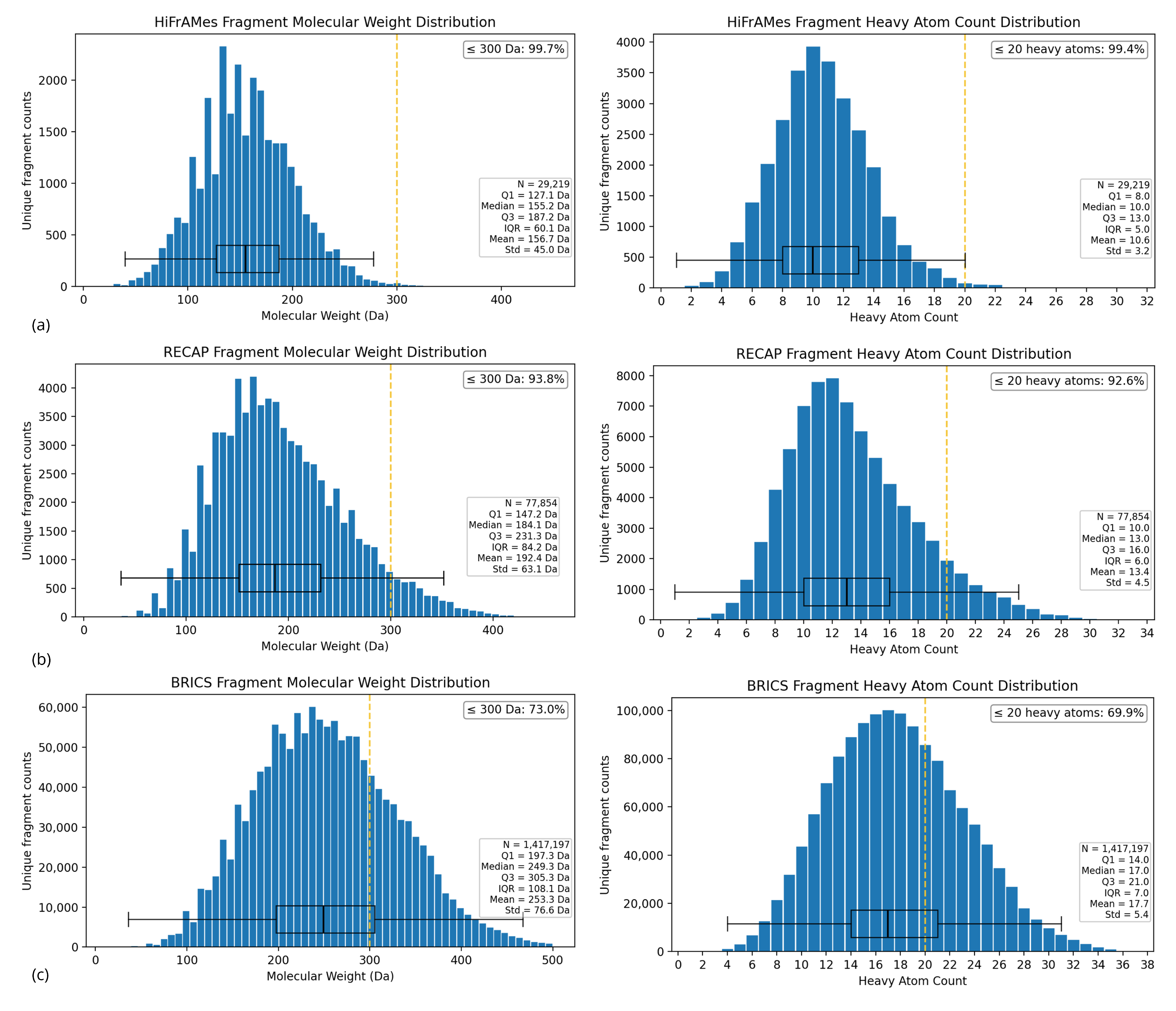 Figure 17. These results demonstrate that HiFrAMes generates a substantially more compact fragment vocabulary compared to RECAP and BRICS. This indicates markedly higher fragment reuse across molecules for HiFrAMes, suggesting that it captures recurring topological motifs rather than producing a large number of idiosyncratic fragments. Consistent with FBDD criteria, 99.7 % of HiFrAMes fragments fall below 300 Da and 99.4% contain no more than 20 heavy atoms, exceeding the corresponding proportions for RECAP (93.8% and 92.6%) and BRICS (73.0% and 69.9%). These trends are clearly visible in the molecular weight and heavy atom count histograms, where HiFrAMes exhibits tightly bounded unimodal distributions with limited tails, whereas RECAP shows broader distributions, and BRICS produces a pronounced shift toward larger and more complex fragments. Notably, when both size criteria are applied jointly (MW ≤ 300 Da and HAC ≤ 20), 99.3% of HiFrAMes fragments satisfy fragment-like constraints, compared to 91.9% for RECAP and 68.3% for BRICS. These results demonstrate that HiFrAMes avoids the under-fragmentation observed in conservative rule-based methods, preventing the explosion of large or overly complex fragments characteristic of more aggressive retrosynthetic cleavage strategies, enabling greater fragment reuse.