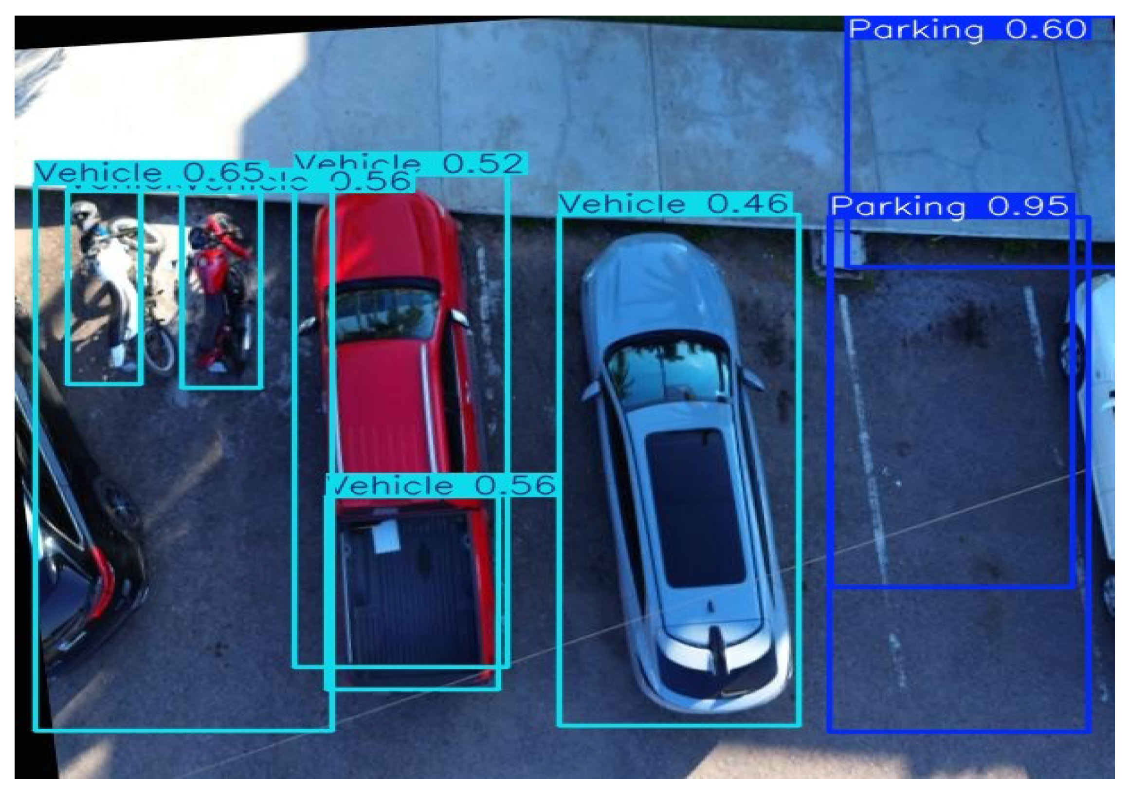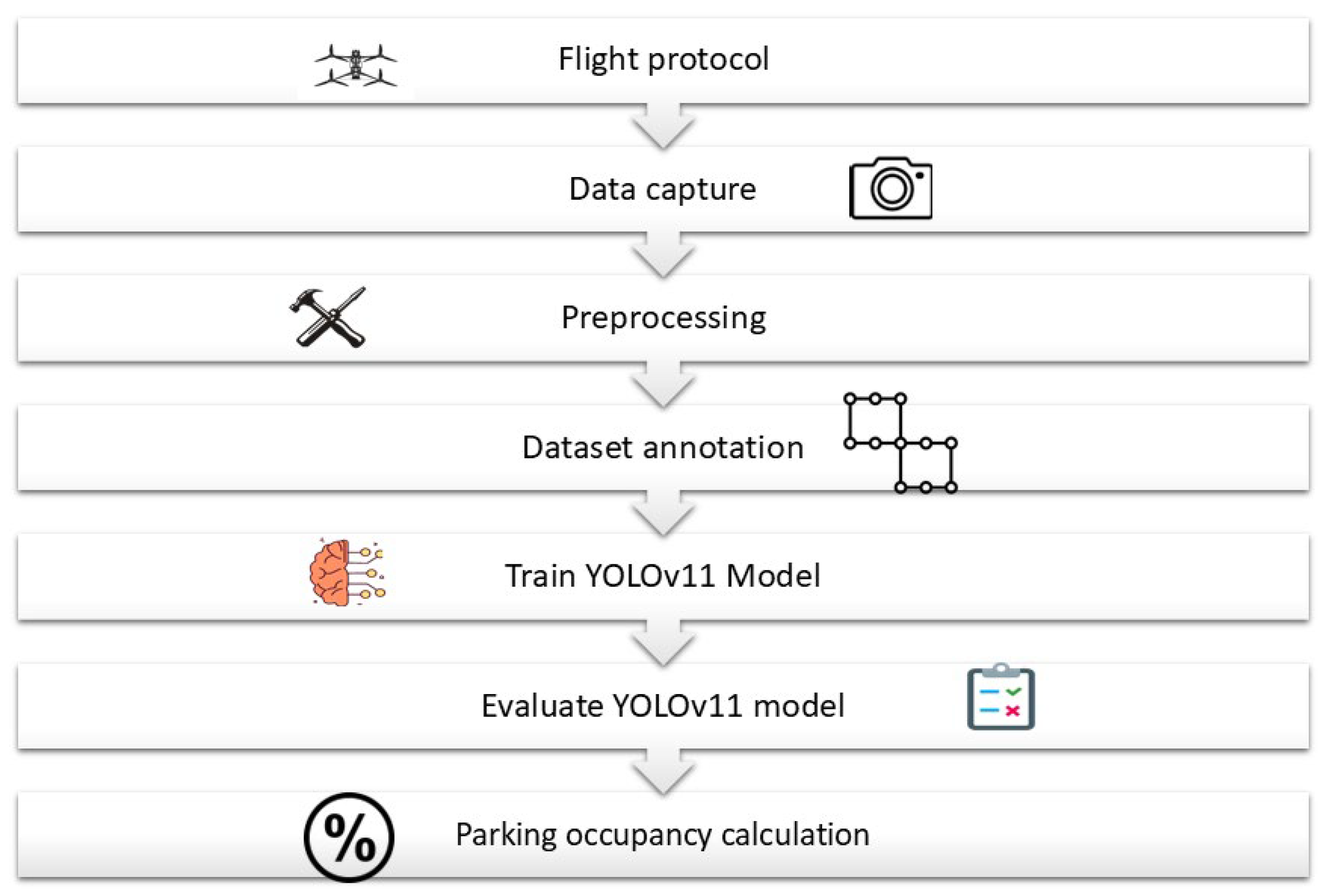In this context, unmanned aerial vehicles (UAVs) have emerged as a versatile and economical alternative for capturing aerial images. Their ability to cover large areas, maintain stable overhead perspectives, and operate without fixed infrastructure makes them ideal tools for monitoring parking lots. Numerous studies have shown that combining UAVs with a deep learning-based object-detection model can achieve accurate metrics of over 90% for aerial vehicle detection [