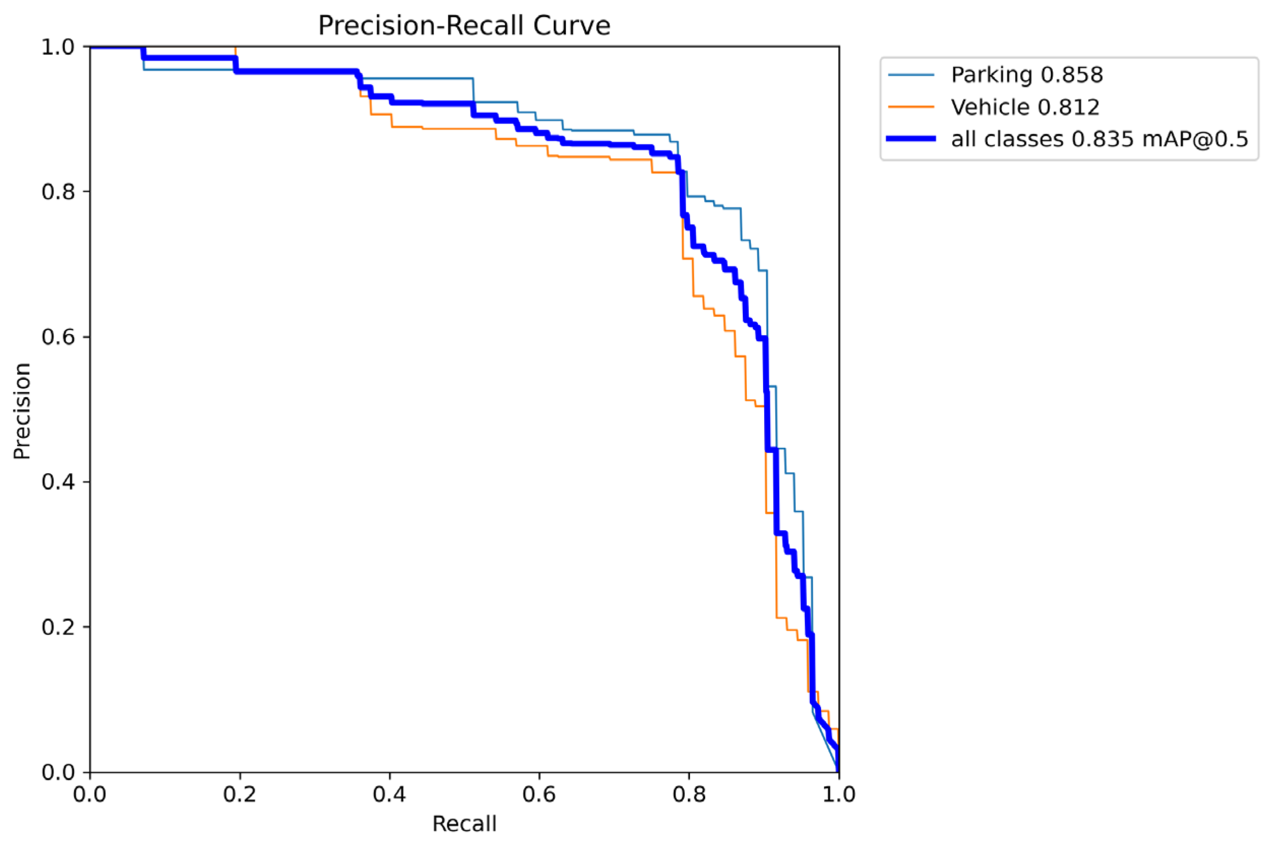 The results show that the proposed system achieves a map@0.5 of 0.97 and an inference speed of 38 FPS, surpassing previous models such as YOLOv8 and WALDO (Whereabouts Ascertainment for Low-Lying Detectable Objects). These findings demonstrate the viability of the solution for implementation on university campuses, in public parking lots, and in smart cities.