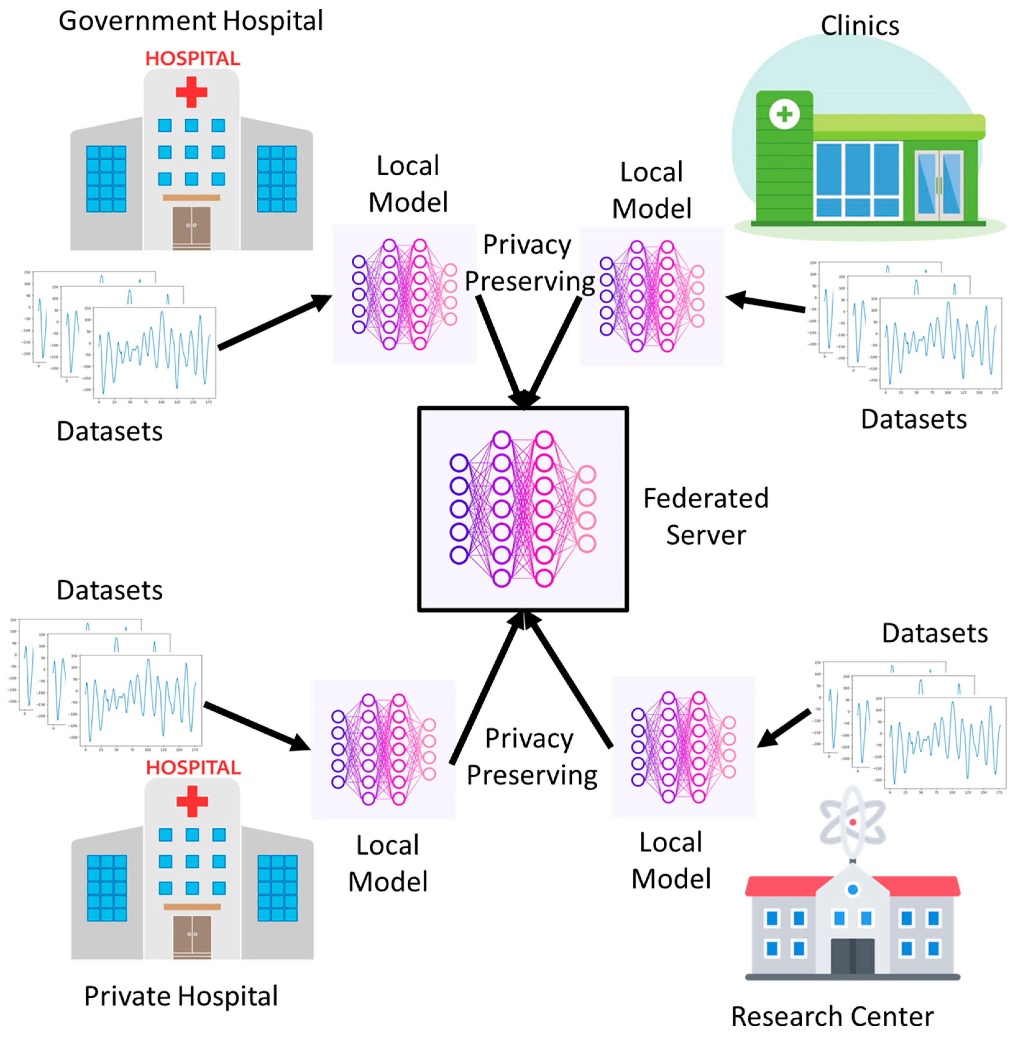 - Baghersalimi, S.; Teijeiro, T.; Atienza, D.; Aminifar, A. Personalized real-time federated learning for epileptic seizure detection. IEEE J. Biomed. Health Inform. 2022, 26, 898–909. [Google Scholar] [CrossRef] [PubMed]
