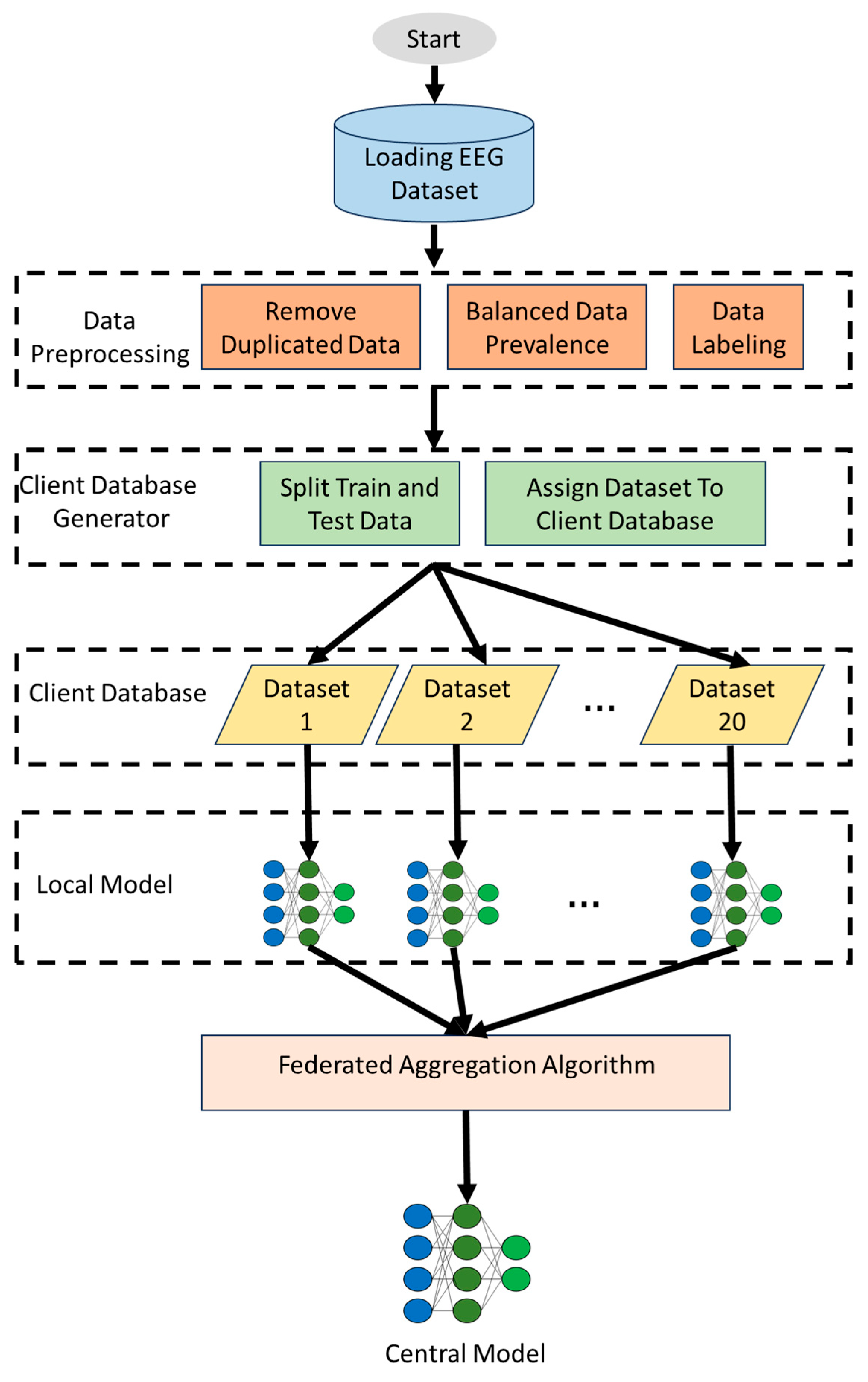 - Lim, Z.Y.; Pang, Y.H.; Ooi, S.Y.; Sekaran, S.R.; Chew, Y.J. FCEEG: Federated learning-based seizure diagnosis through electroencephalogram (EEG) analysis. Cogent Eng. 2025, 12, 2547636. [Google Scholar] [CrossRef]