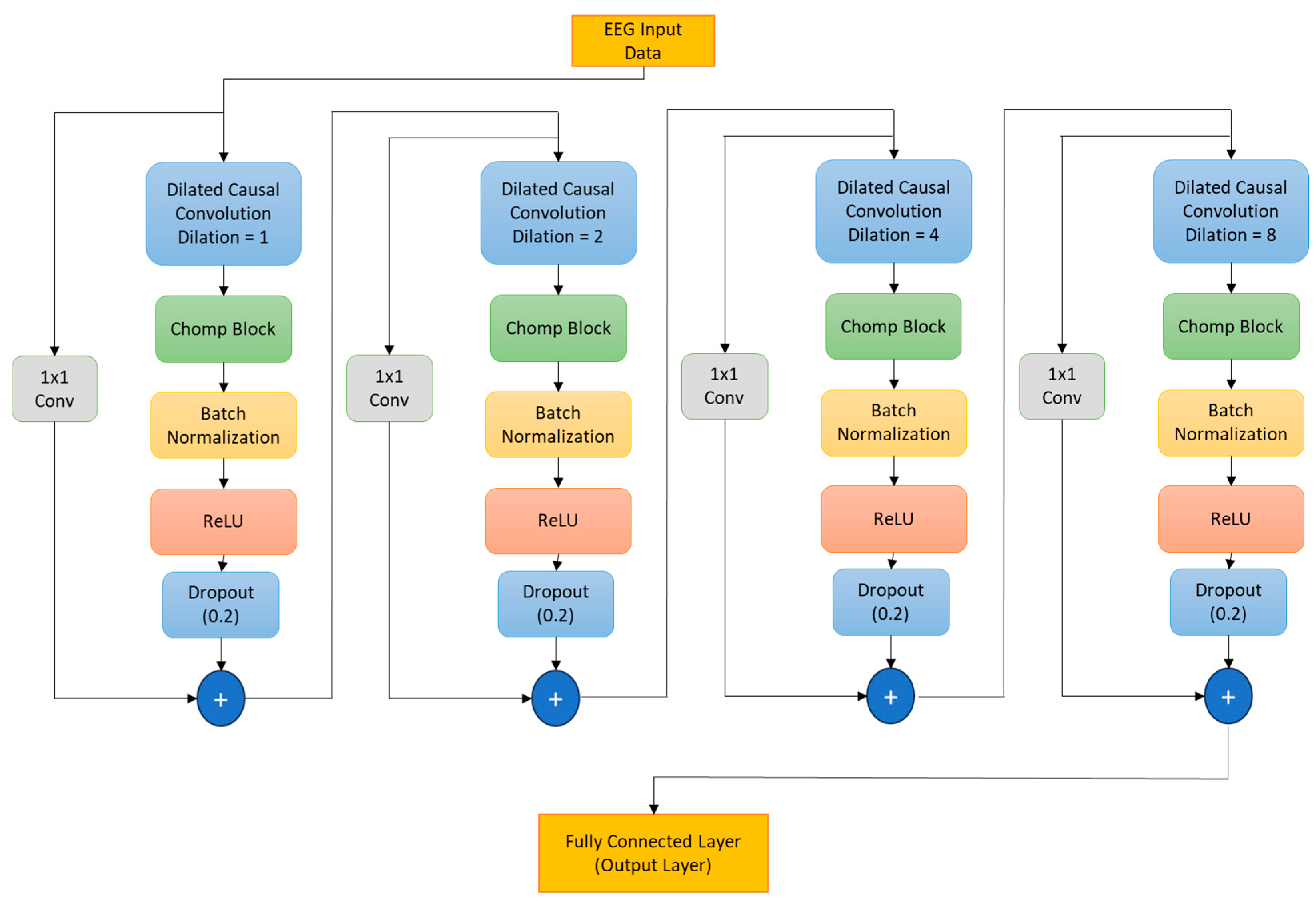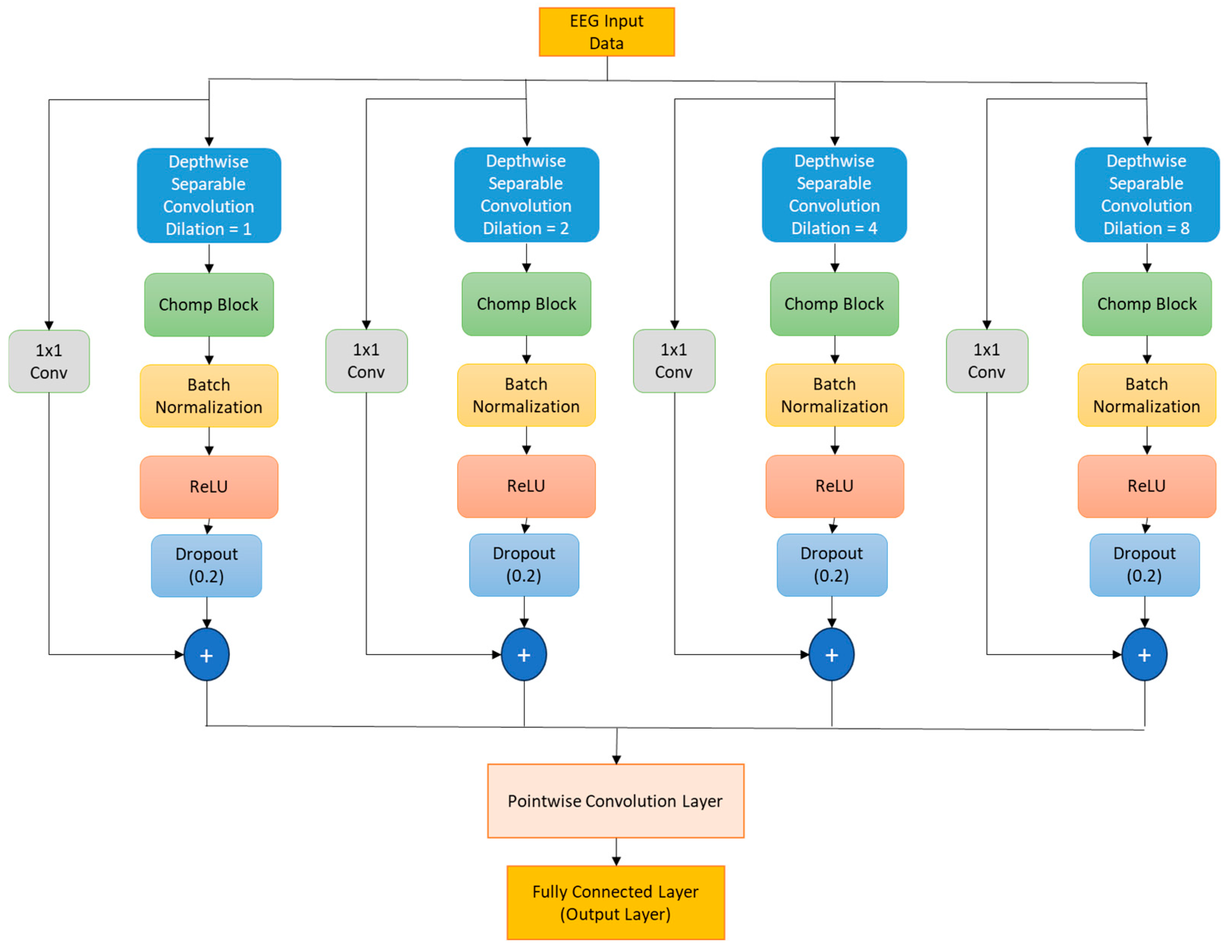 - Depthwise separable Temporal Convolutional Networks—We propose a compact model which replaces plain convolutions with depthwise operations, significantly reducing the number of parameters while keeping its temporal-feature extracting ability, an important factor for analyzing EEG data [8].