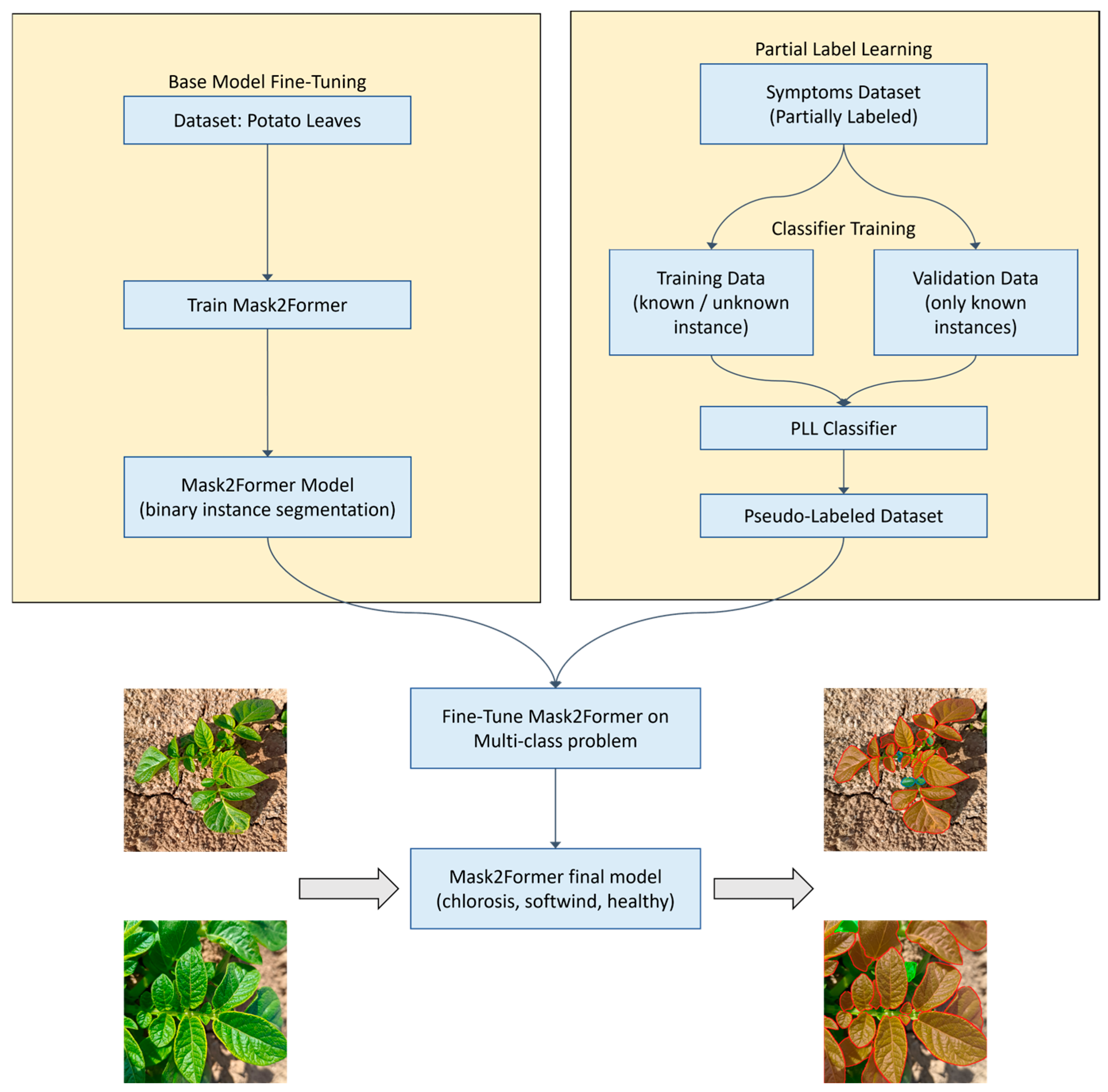 27] classifier, trained with instance masks cropped from the dataset while exploring different disambiguation and mask cropping methodologies. Finally, the initial Mask2Former model is transferred and fine-tuned on this refined, pseudo-labeled dataset, targeting the two abiotic stress symptoms, yielding precise instance masks while maximizing data utilization. Experimental evaluations demonstrate the efficacy of this framework, achieving an instance segmentation mAP of 89% and a label disambiguation accuracy of 95% on the validation set.