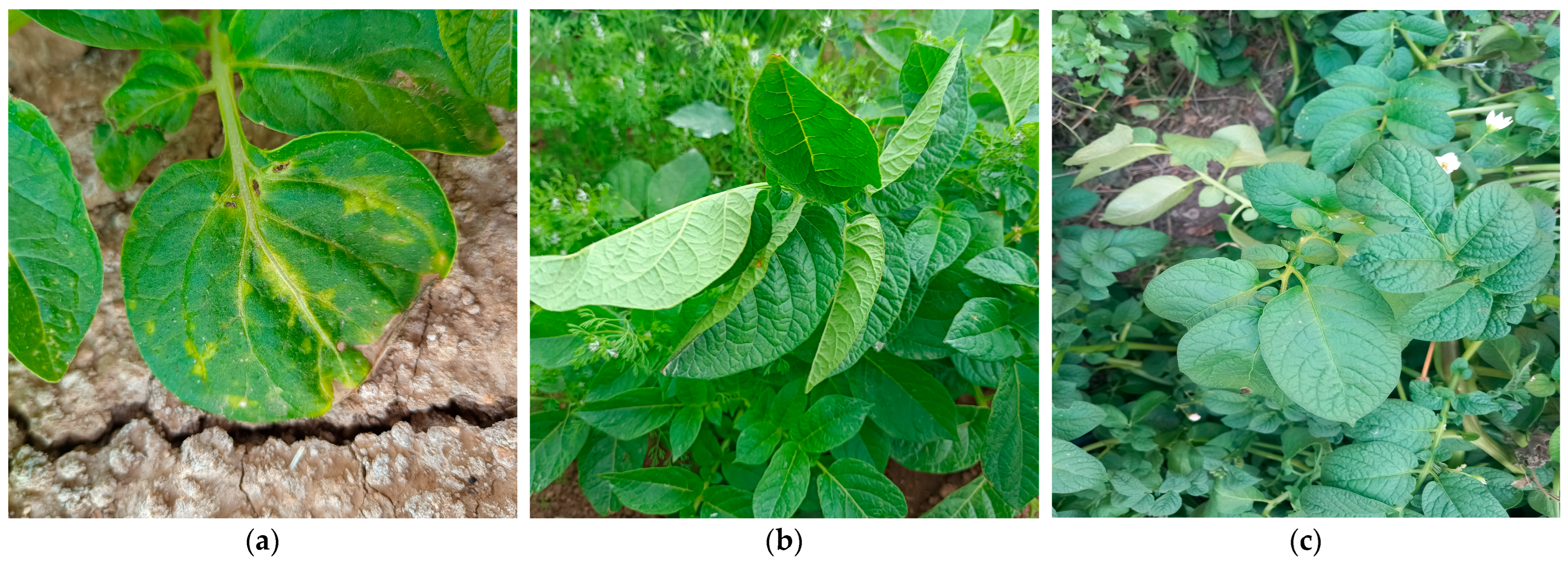 The capture target classes were healthy potato leaves, or potato leaves with symptoms of interveinal chlorosis or leaf curling. The data capture was performed by expert phytopathologists in fields located in Volos, Magnesia, Greece for healthy potato plants on fields, and in La Palma, Cartagena, Murcia, Spain for symptomatic potato plants and further healthy leaf captures.