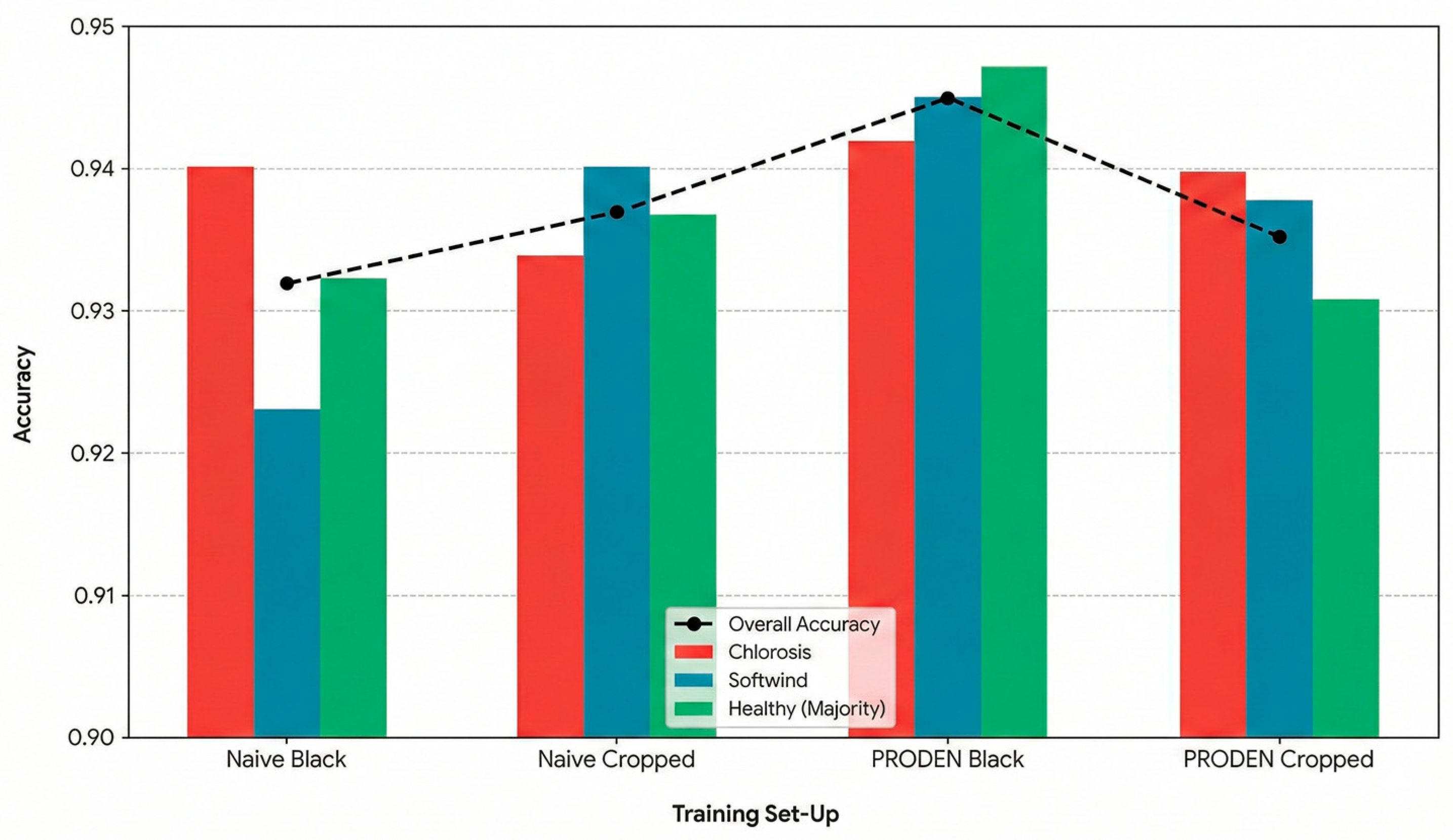 Figure 4, PRODEN strategy with black padded masks results in the most balanced performance across all classes while also breaking the 0.94 accuracy barrier for the healthy class.
