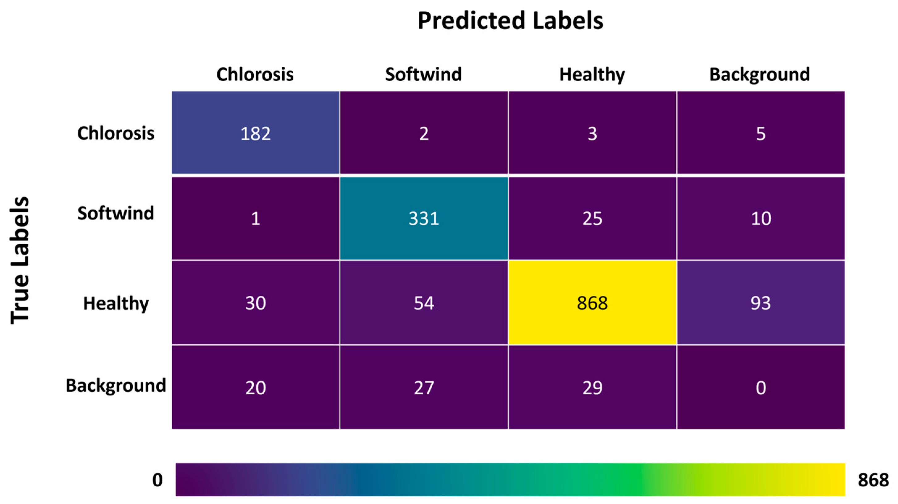 A notable disparity in performance was observed across the three target classes. The Chlorosis class performed exceptionally well (AP50 = 0.939), most probably due to the sharp contrast of yellowing leaf tissue against the green leaf color that provides a clear signature for the Masked Attention mechanism. The Softwind class also showed strong results (AP50 = 0.901), as the structural changes, specifically leaf curling, create unique geometric boundaries that the Transformer-based queries can effectively isolate. However, the Healthy class recorded lower metrics (AP50 = 0.827). This can be attributed to two main factors: inter-class ambiguity and the annotation logic. Early-stage stress symptoms may mimic healthy leaf morphology, since the distinct characteristics are not fully visible, leading to inherent classification difficulty. In addition, as observed in the visual assessment and the confusion matrix of the experiment, many “false positives” were correctly segmented healthy leaves that were simply not part of the manual annotation split because they were in the background or out of focus. This suggests the model’s true precision for healthy leaves is higher than the numerical evaluation indicates.