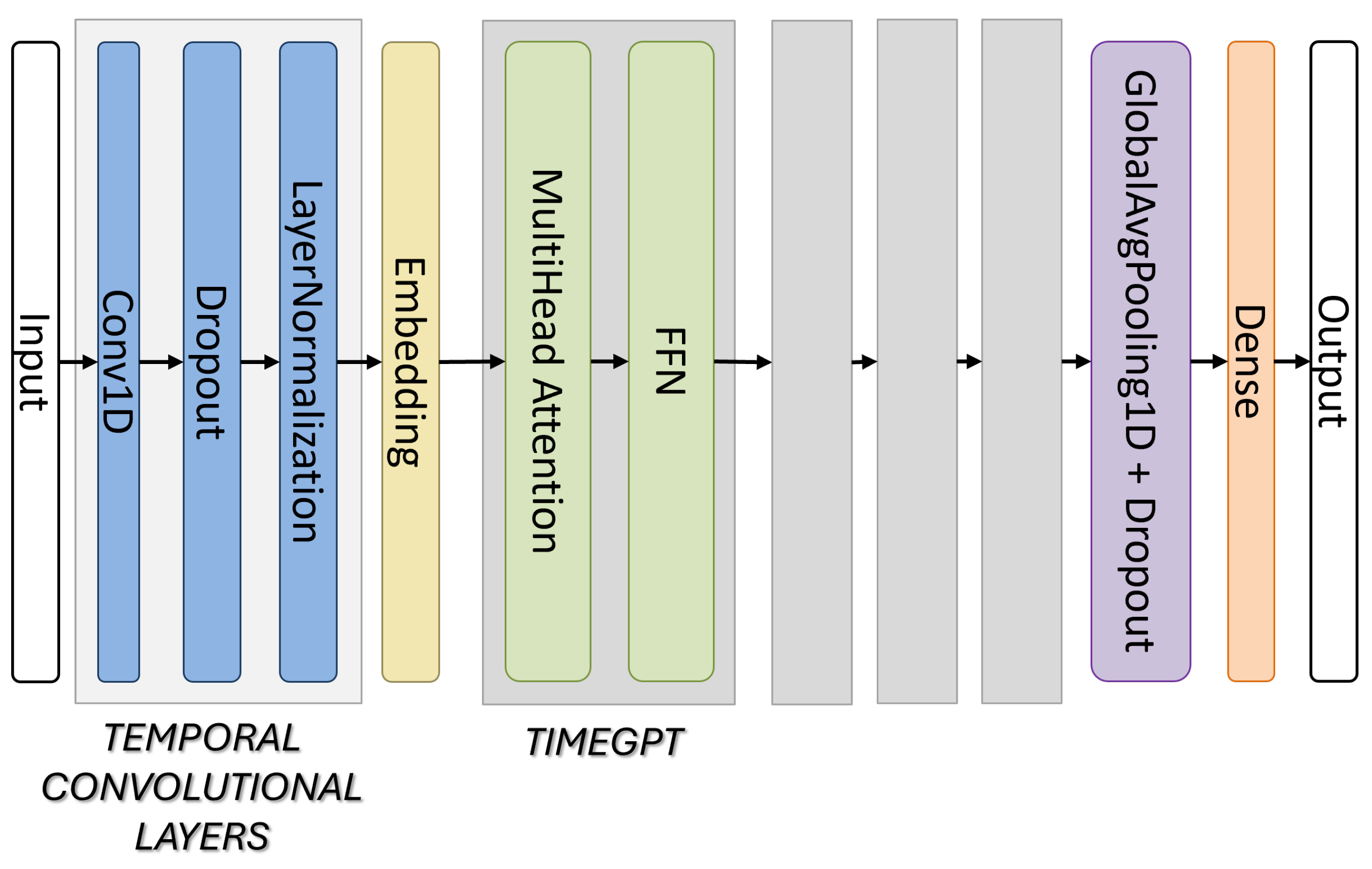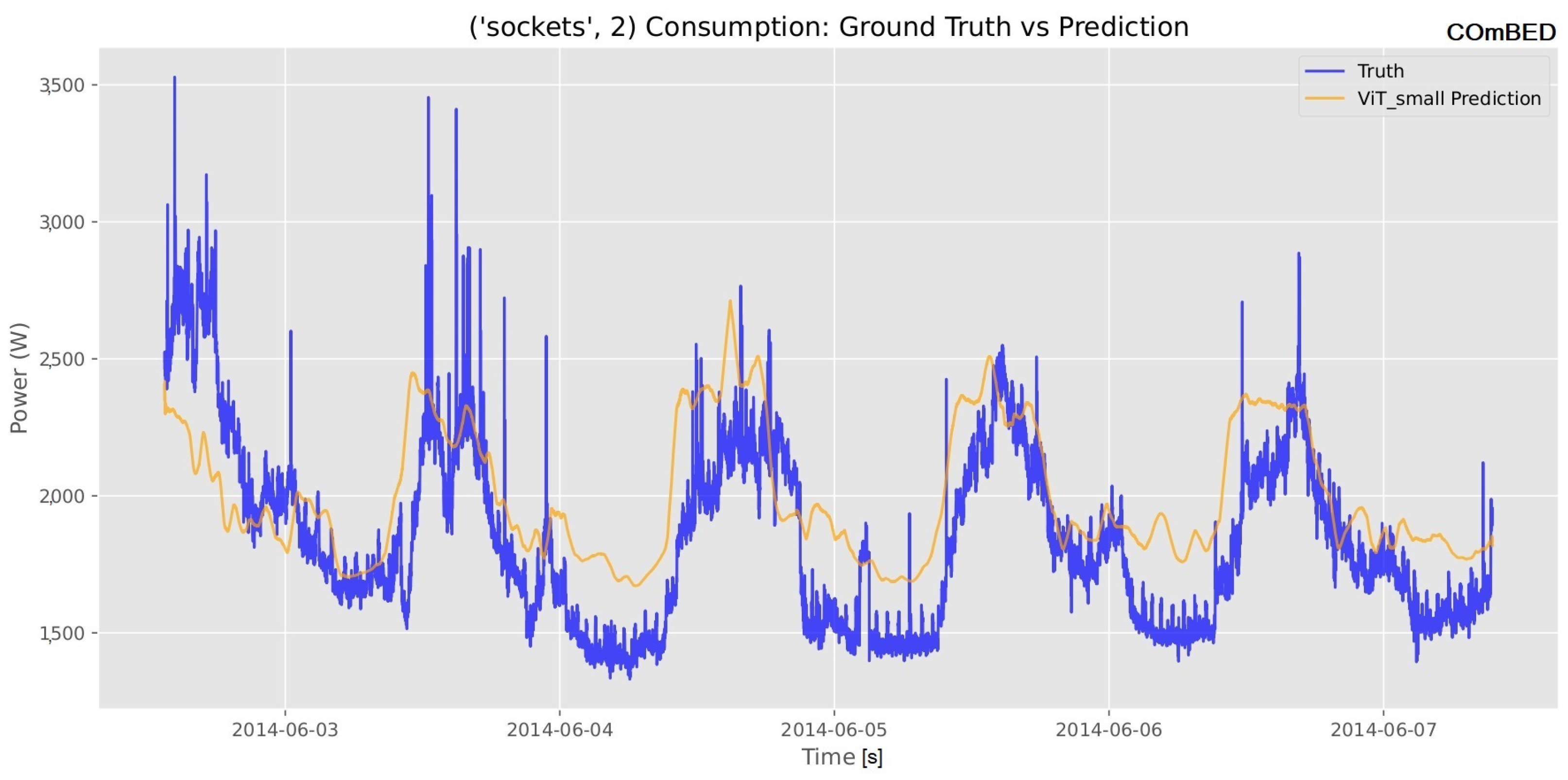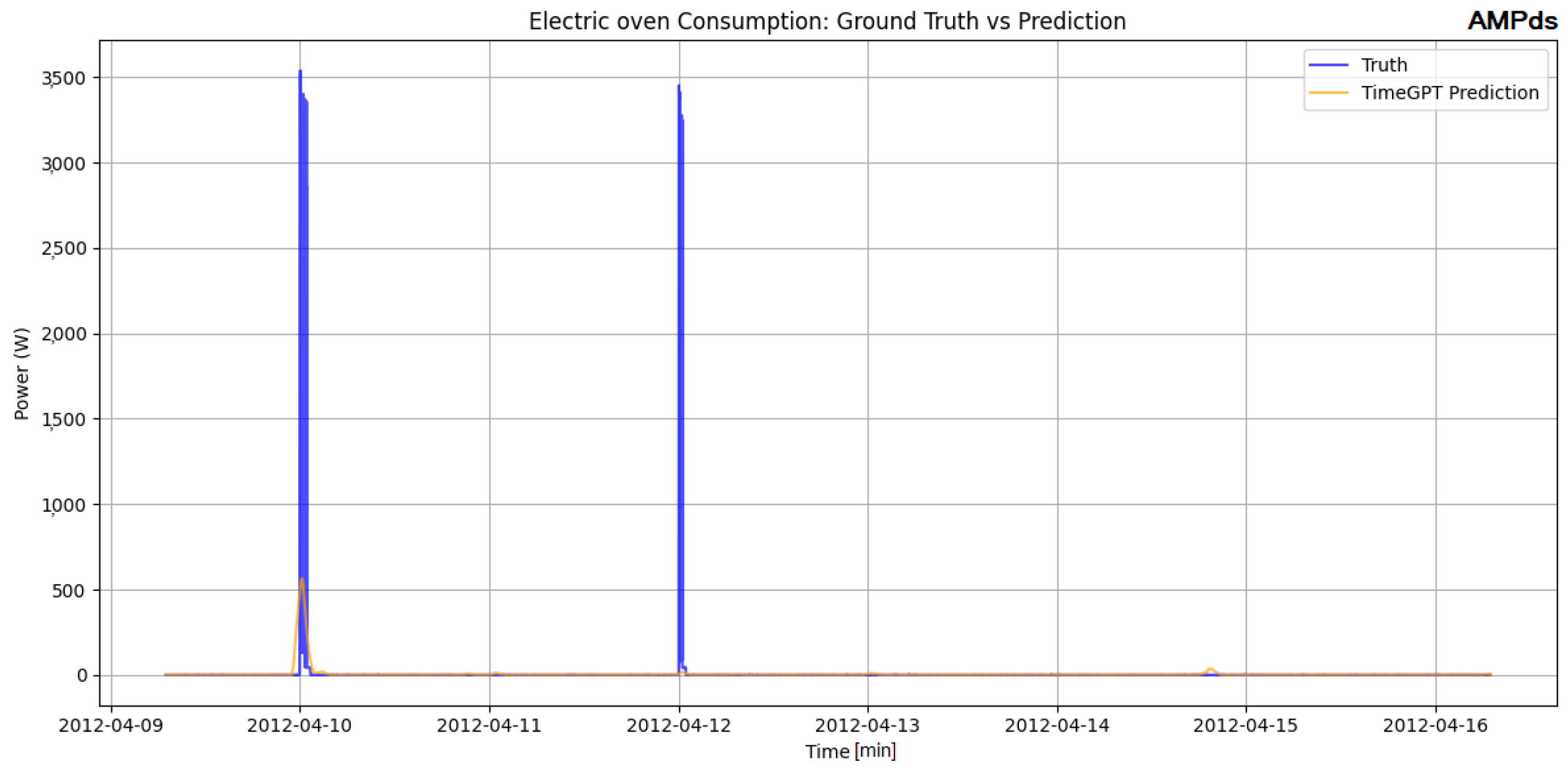 The electric oven results revealed the greatest divergence from expectations. With an intermediate Pearson correlation of 0.182, only Prophet (F1-score = 0.50) and TimeGPT (F1-score = 0.41) achieved any detection capability. Most models, including RF and ViT variants, obtained F1-scores of 0.00, indicating complete failure in identification. This unexpected result suggests that Pearson correlation alone is not a sufficient predictor of NILM performance, with sporadic oven usage and potential confusion with other high-power loads complicating the disaggregation task. The TimeGPT-inspired model detects some activation events but struggles with the sporadic usage pattern, as shown in