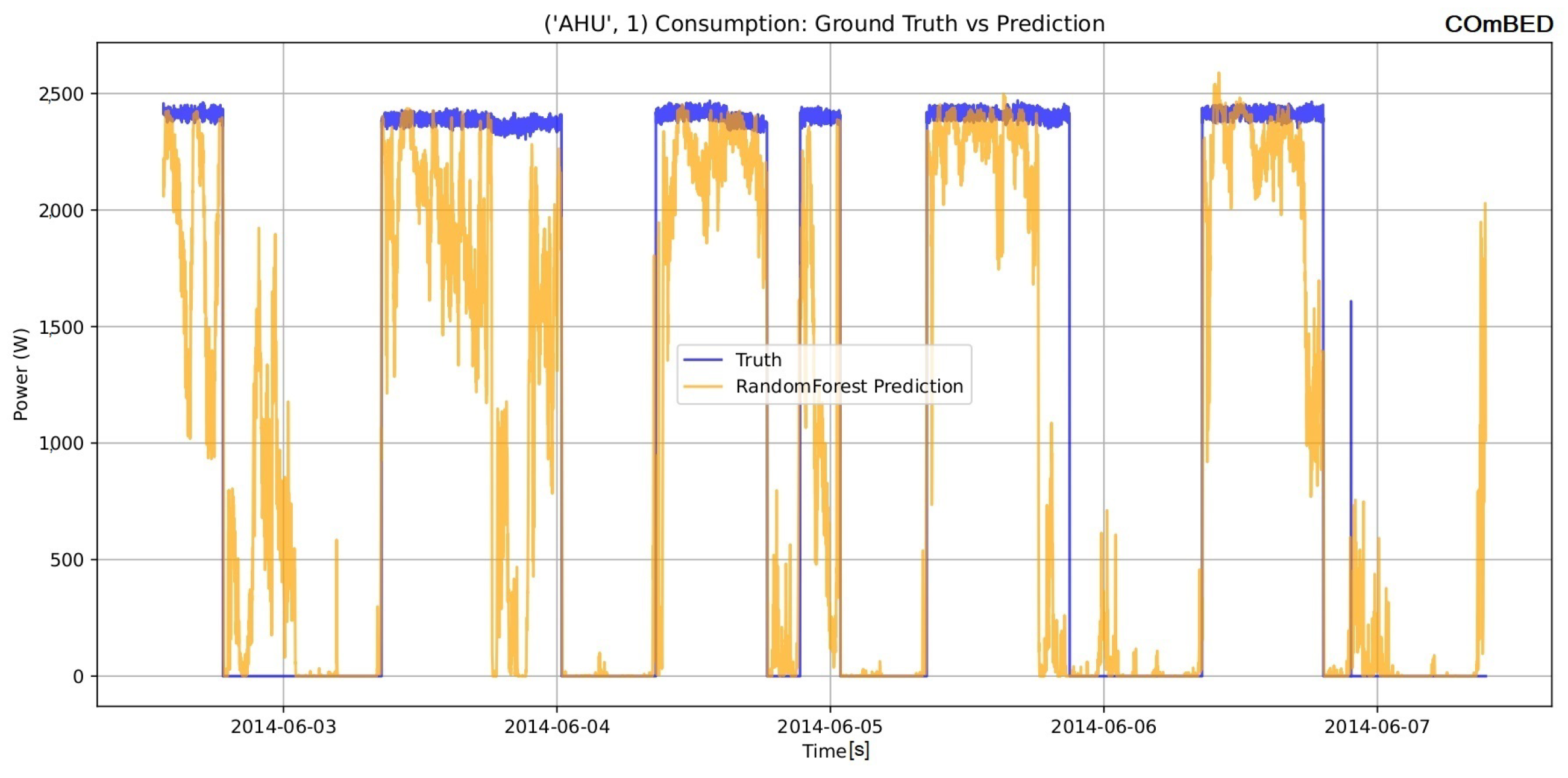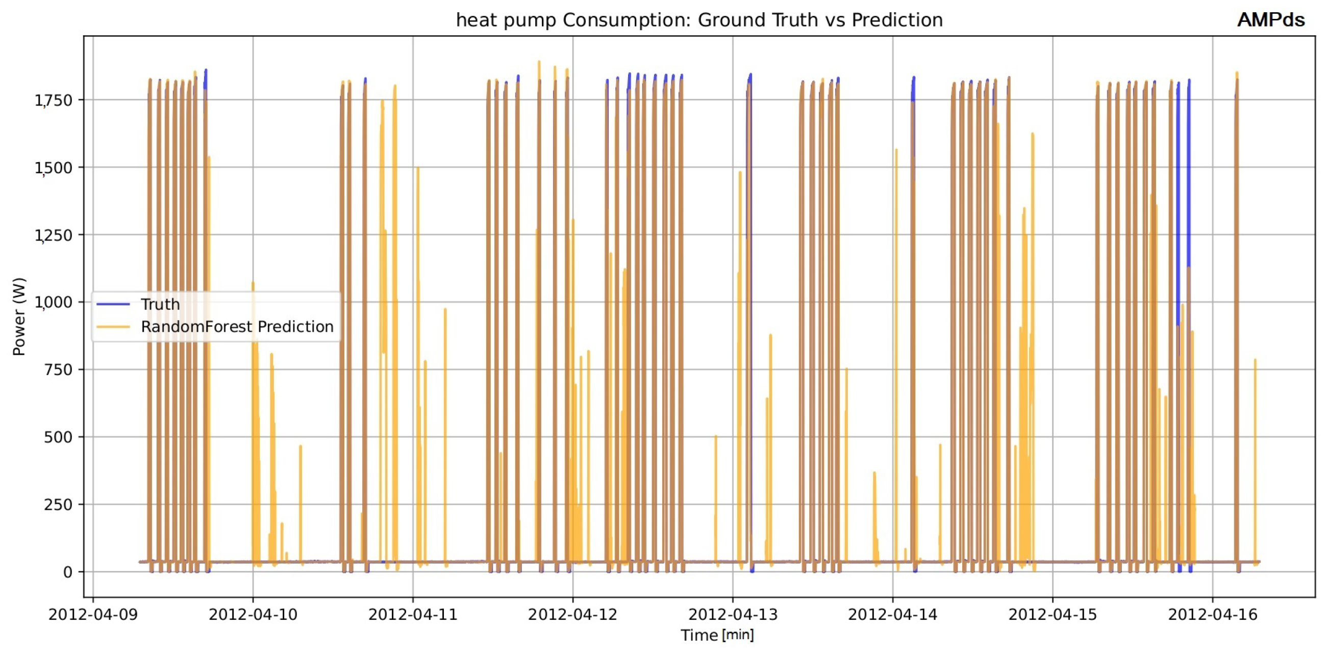 2 of 0.90, suggesting that loads with well-defined operational states and high contribution to total consumption are ideal candidates for disaggregation using traditional machine learning techniques. The RF model accurately captures the ON/OFF state transitions characteristic of this finite-state load, as illustrated in