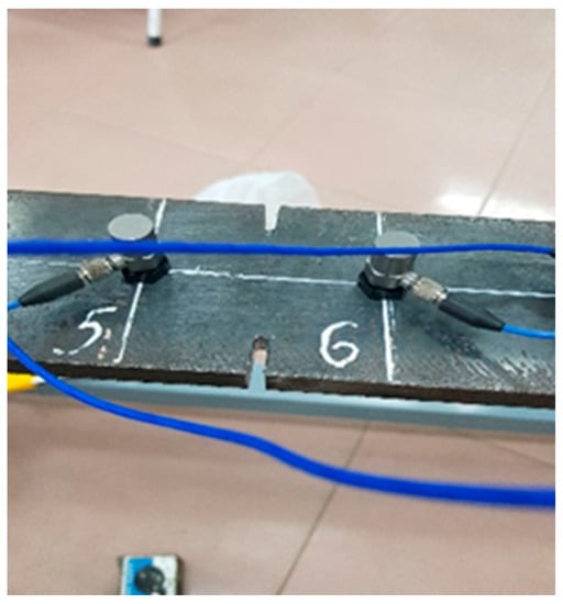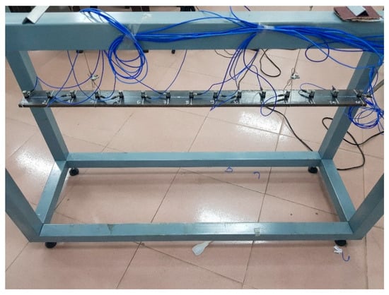 A steel beam, having dimensions of 1 m long × 70 mm wide × 10 mm thick, density of 7820 kg/m3 and the free-free boundary condition, was used for the experiment. The tested beam was suspended by two thin filaments located at the location of accelerometers 4 and 12 to simulate the free-free boundary condition. On the top of the beam, fifteen accelerometers were attached with sensitivity ranges from 10.13 to 10.50 mV/m·s−2. A hammer was used as an excitation force. The tested beam was excited once a time at the location of accelerometer 8 by the hammer. A laptop and National Instruments (NI) equipment were used to record the vibration data. Figure 1 shows the experimental setup in the laboratory and Table 1 shows the location of the accelerometers. The locations in Table 1 are the distance from the accelerometers to the left end of the beam.