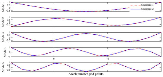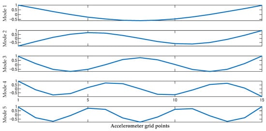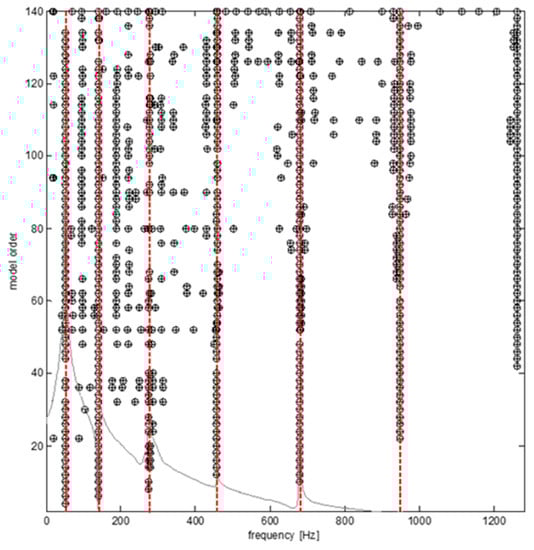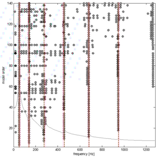 To analyze the collected data, covariance-driven stochastic subspace identification algorithm (SSI-COV) was used thanks to lower time consumption for computation and accuracy [,,]. In general, physical modes and spurious modes are distinguished using a stabilization diagram. A clear stabilization diagram implies that the physical modes are present with consistent modal parameters such as frequencies, damping ratios, and mode shapes. To do that, we compared the poles corresponding to a certain model order to the poles of a one-order lower model. A stable pole is labelled if the differences of frequency, damping ratio, as well as mode shape were within the preset criteria. On the basis of our experience, strictly preset criteria are 1% for frequencies, 5% for damping ratios, and 1% for the mode shape vectors. The stable poles in the stabilization diagram should be selected first (Figure 2). The first five bending modes were identified based on the stabilization diagram, as shown in Figure 3 and presented in Table 2.