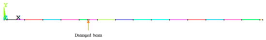 For the damaged beam, the damaged elements were modeled by a reduced width of the cross section. The dimensions of the cross section are and mm for Scenario 1 and Scenario 2, respectively. The models of the intact and damaged beam are illustrated in Figure 7.