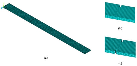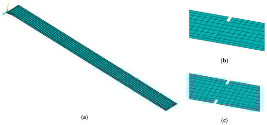 The shell element model of the intact and damaged beam: (a) intact beam, (b) damage Scenario 1, and (c) damage Scenario 2.