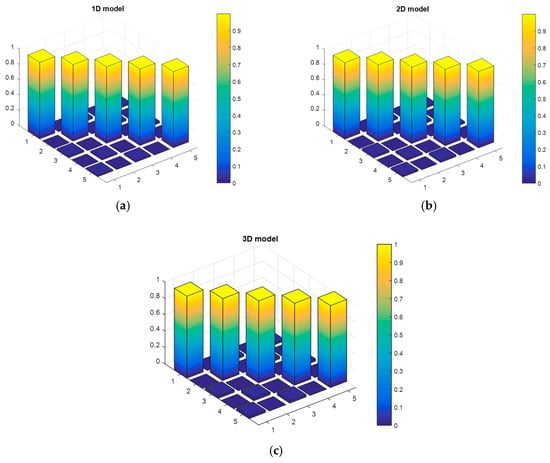 MAC values between experimental and simulated mode shapes: (a) 1D model, (b) 2D model, and (c) 3D model.