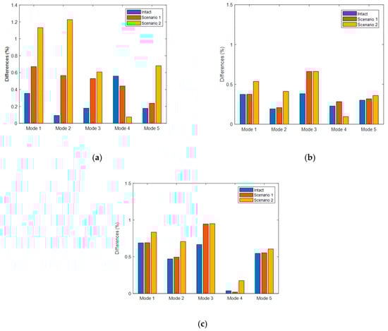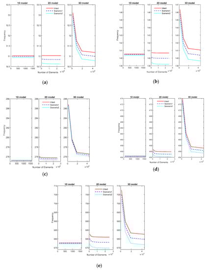 For the numerical models, the number of elements in each model affects the natural frequencies. Figure 11 illustrates the frequencies extracted from the three FE models for the first five modes. The natural frequencies converge when the number of elements in the numerical model increases. Moreover, the 1D model uses a smaller number of elements than the 2D model. The convergence curve of frequency from the 1D model is approximately a line, whereas the 2D model needs more than 1000 elements and the 3D model needs more than 2000 elements to converge. Moreover, one beam element has two nodes, one shell element is presented by four nodes, and one solid element is modeled by eight nodes. Therefore, the computation time for the 3D model is the longest. The converged natural frequencies extracted from the FE model are presented in Table 4 (intact beam), Table 5 (Scenario 1), and Table 6 (Scenario 2). The differences between FEM and experimental data are then calculated and plotted in Figure 12. These are less than 1% in all cases; that is, the FEM can reflect the behavior of the experimental beam.
