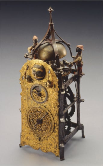 Wall Clock with Automation, Southern Germany 1550/1600. Iron, bell metal, brass, gilt copper, and polychrome decoration 35.56 × 15.24 × 16.51 cm. Milwaukee Art Museum, Purchase, with funds in memory of Betty Croasdaile and John E. Julien M2002.182. Photographer credit: John Nienhuis.