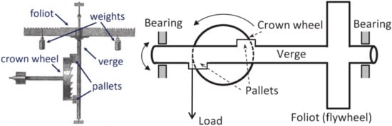 - Wagner, J.; Moline, D.; Vold, E. Model of a Mechanical Clock Escapement; Clemson University TigerPrints (American Association of Physics Teachers): Clemson, SC, USA, 2012; pp. 590–606. [Google Scholar]