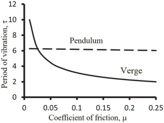 The value supplied by Equation (24) is consistent with the literature statements that the introduction of the pendulum between 1658 and 1673 resulted in the improvement of the accuracy of the clock by 30 times [5]. Typical dependencies of the period of oscillation on the coefficient of friction for the verge (solid) and pendulum (dashed) mechanism based on Equations (20) and (23) are shown in Figure 5. It is observed that the mechanism without a pendulum is much more sensitive to the change in friction.