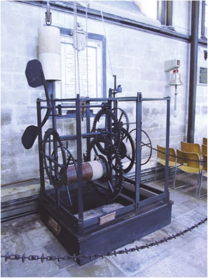 - Dubois, P. De Vick tower clock, built Paris, 1379, by Henri de Vick. In Historie de l’ Horlogeri; Maxtor: Paris, France, 1849; p. 221. [Google Scholar]