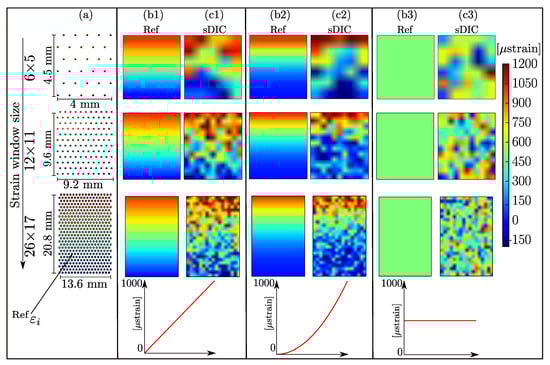 Simulated strain distribution: (a) Discrete strain distribution showing measured points at the facets center for three strain windows with 6 × 5, 12 × 11 and 26 × 17 points which corresponds to a 4.5 × 4 mm, 9.6 × 9.2 mm, and 20.8 × 13.6 mm area, respectively. (b1–b3) Two-dimensional representation of linear, quadratic and constant simulated strain fields respectively. (c1–c3) strain distributions with imposed Gaussian noise obtained from digital image correlation (DIC) measured data points.