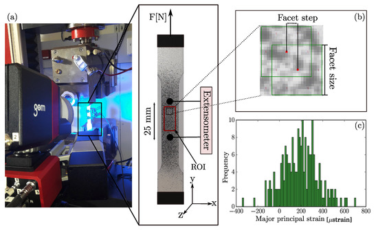 The noise-floor of the DIC measurement was evaluated by capturing 10 images of each sample, at 1 Hz and 8 ms exposure time, while the sample was mounted on the testing machine without any load applied (zero-strain). The strain window corresponding to the measurement area between the extensometer has measurement points for a facet size of pixels with a facet step of 16 pixels (50% overlapping); these parameters are recommended by ARAMIS for 6 Megapixel CCD cameras [], see Figure 2b in red as the region of interest (ROI). This pre-test was used to obtain reasonable noise levels for the simulated noise. The maximum noise at zero-load was less than strain, the average noise ranged from 140–210 strain and the standard deviation ranged from 200–270 strain for the 10 captured images (a value of 300 strain was taken as a worst case scenario and imposed on the simulated strain fields). The histograms of the strain measured were similar to Figure 2c. Finally, the steel samples were subjected to a uniaxial tensile load along the vertical direction with cross-head movement of 5 mm min until fracture. A universal extensometer (ZwickRoell GmbH, Germany) was attached to the samples in the gauge region (25 mm in length), from which the uniaxial global strain was obtained and referred to as reference strain (). The strain fields were subsequently exported from the ARAMIS Professional software (ARAMIS v6.3.1; GOM) as .csv file containing the node number, x-, y-, z-coordinates, and the measured strain values for plotting and post-processing with Python SciPy.
