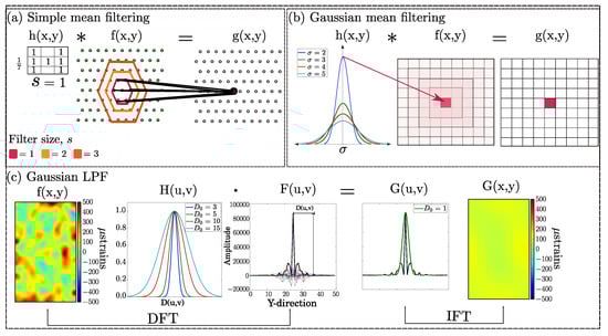 The three filters have similar working principle, since the simple mean and Gaussian mean filtering perform convolution in spatial domain and differ only in two aspects; (a) the shape of the filter being ideal or Gaussian distributed; and (b) the shape of the kernel (hexagonal or square). Gaussian mean and Gaussian LPF are well alike, since convolution in the spatial domain is equivalent to multiplication in the frequency domain and vice versa []. Despite the similar working principle of these filters, differences in the results are observed.