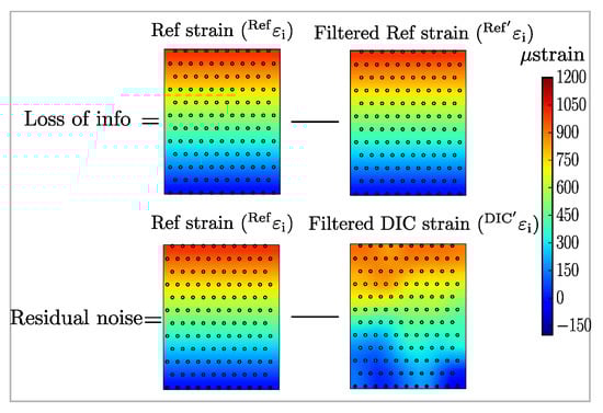 The filtering efficiency is measured by two terms of error; the loss of information and the residual noise. The loss of information is the amount of true signal lost when the reference strains at measurement points () were filtered () Equation (3). The residual noise is the distance between each reference point () and filtered noisy point () for each stage (see Equation (4) and Figure 4). The total error is the square-root of the sum of the quadratic of both error terms Equation (5) []. The reference strain is either null in the case of zero-strain or the simulated strain field without noise imposed, or is the global strain determined from the extensometer in case of the loaded steel samples. The error was calculated as the RMSE with the following equations.
