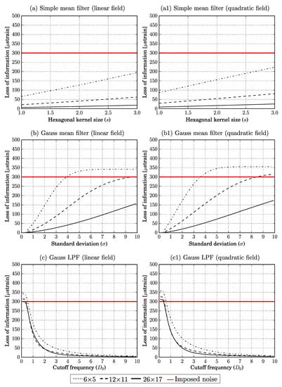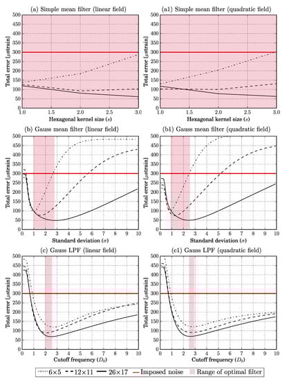 Figure 5, Figure 6 and Figure 7 show the influence of filtering on the loss of information, residual noise and total error, respectively. The loss of information increases with changing the filter size for both the simple means and the Gauss mean filtering, while it decreases for Gauss LPF, as depicted in Figure 5c,c1. The residual noise increases for the simple mean filtering for the smallest window size, and it increases sharply for Gauss mean filtering and mildly for Gauss LPF, as depicted in Figure 6b–c1. The optimal filtering parameters were found based on the total error curve, as depicted in Figure 7; the opaque pink bar shows the range of the optimal filtering parameters, which was determined where the total error had a minimum for each strain window and field type. Figure 8 shows the corresponding linear and quadratic strain fields with the specific filtering parameters for each strain window and the overall optimal filtering parameter.
